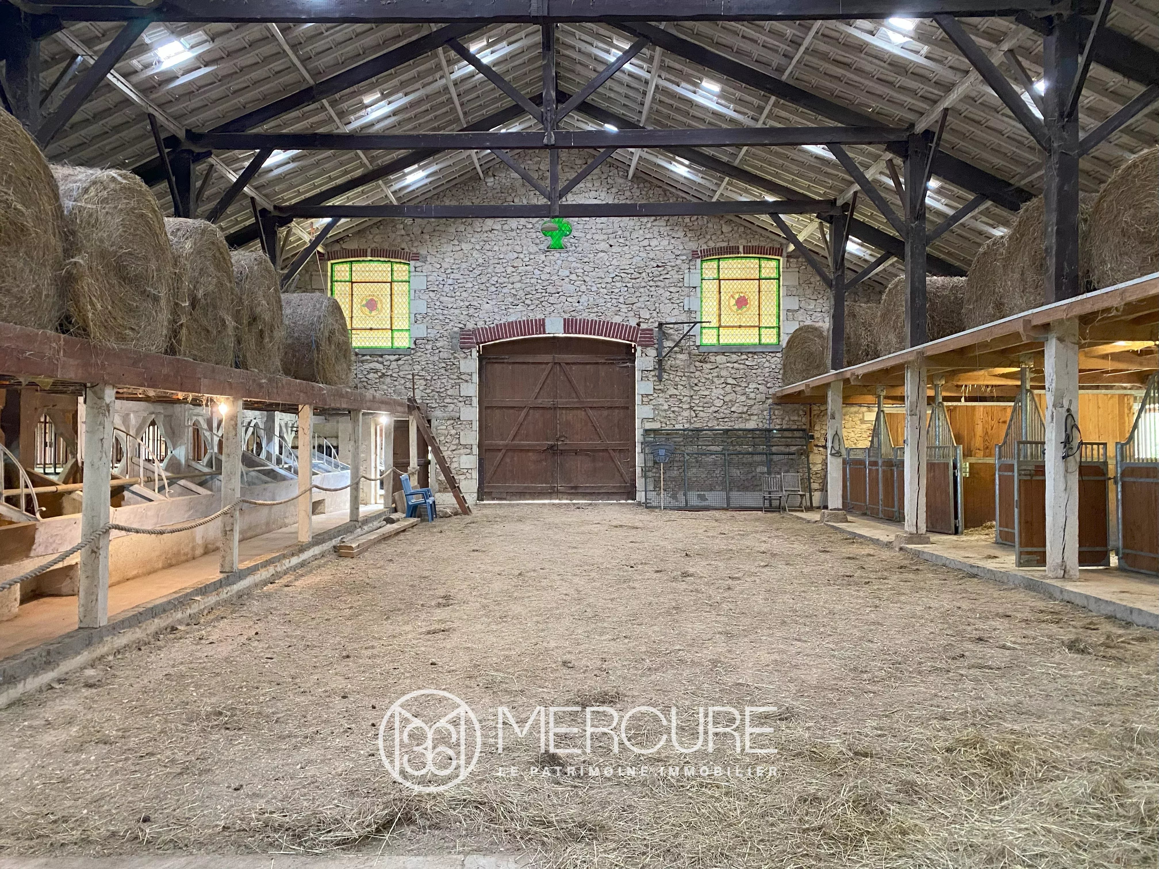 Ancienne grange réinventée, la structure de 1 000 m² abrite 17 boxes spacieux, sellerie, aire de pansage, douche pour chevaux, silo à grain, garage.