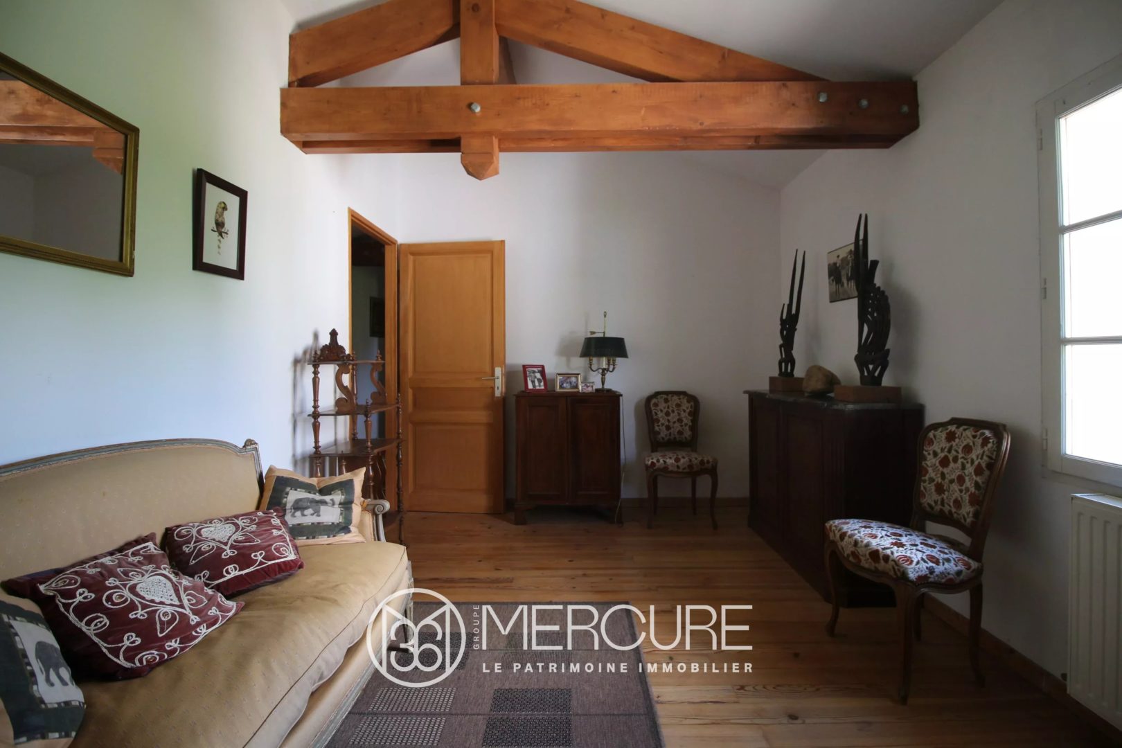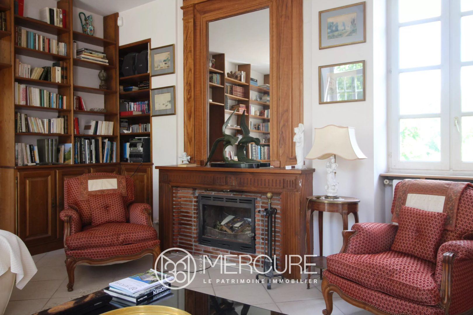– Séjour (62,8 m²), avec escaliers en bois, deux cheminées, anciens placards et bibliothèque