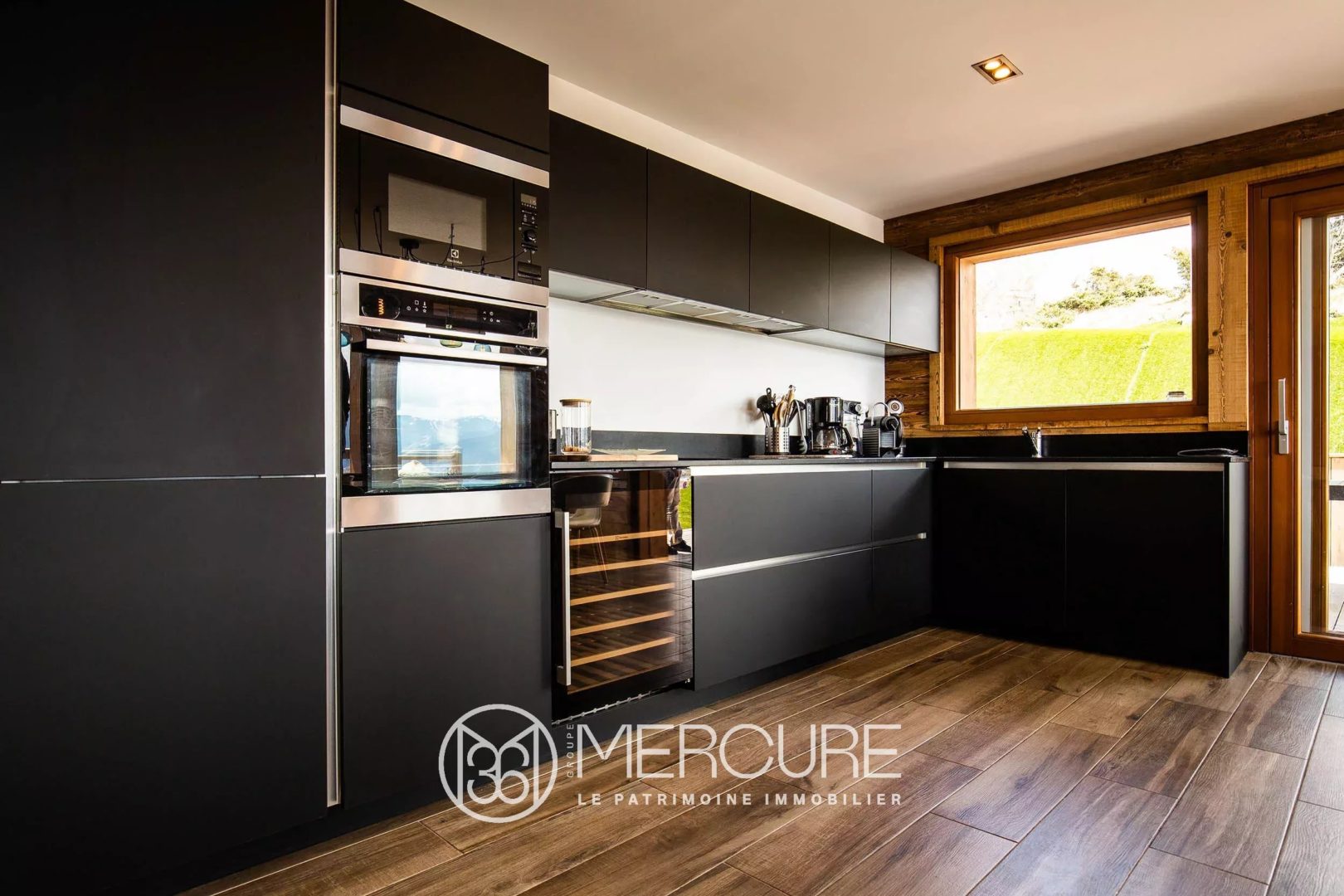 Sélection de différentes essences de bois ancien, de longue sèche, isolation, domotique, prise Tesla dans le garage, cuisine en granit noir du Zimbabwe, cheminée au gaz, décoration industrielle dans l’air du temps, sauna en bois, salle de jeux, jacuzzi/bain nordique sur la terrasse.