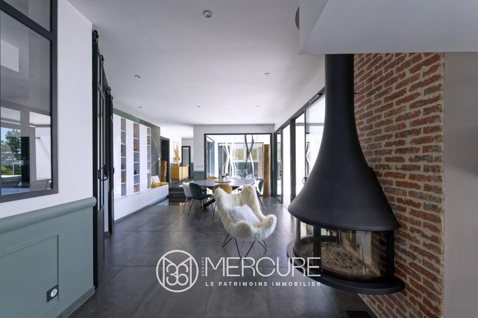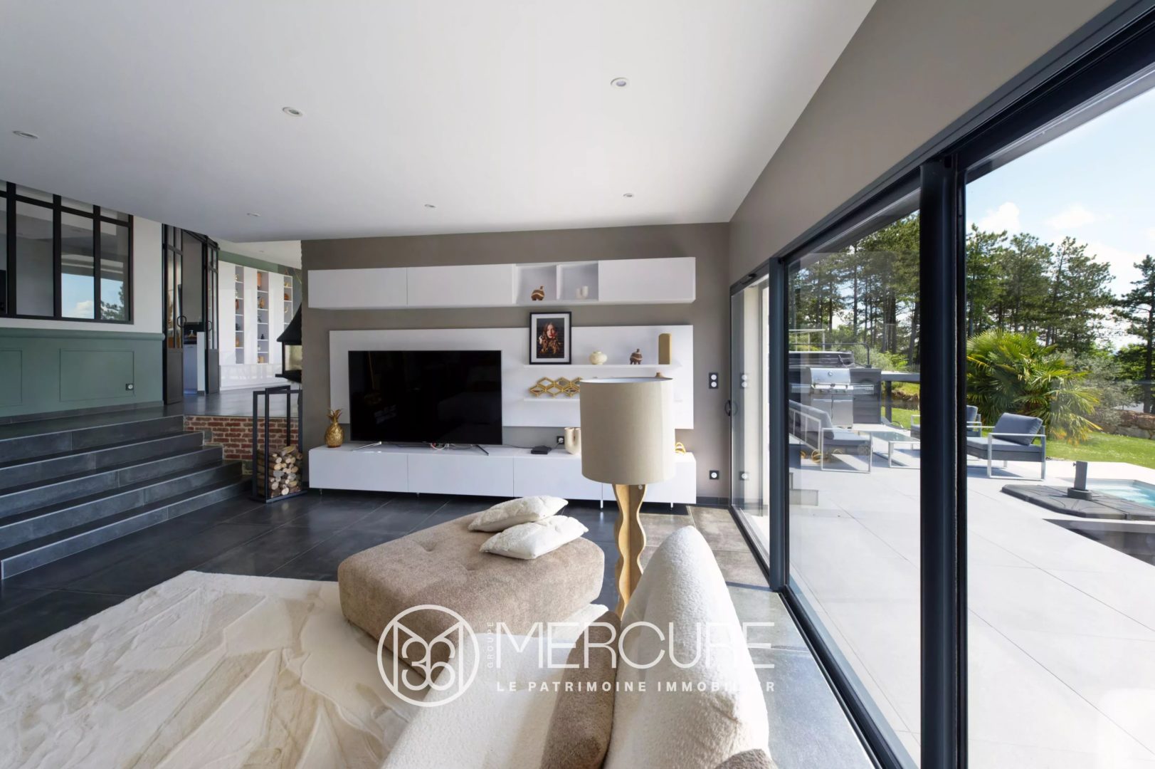 Les espaces de vie sont généreux et lumineux, comprenant un salon avec cheminée, une cuisine haut de gamme entièrement équipée, et une cave à vin unique sous verrière.