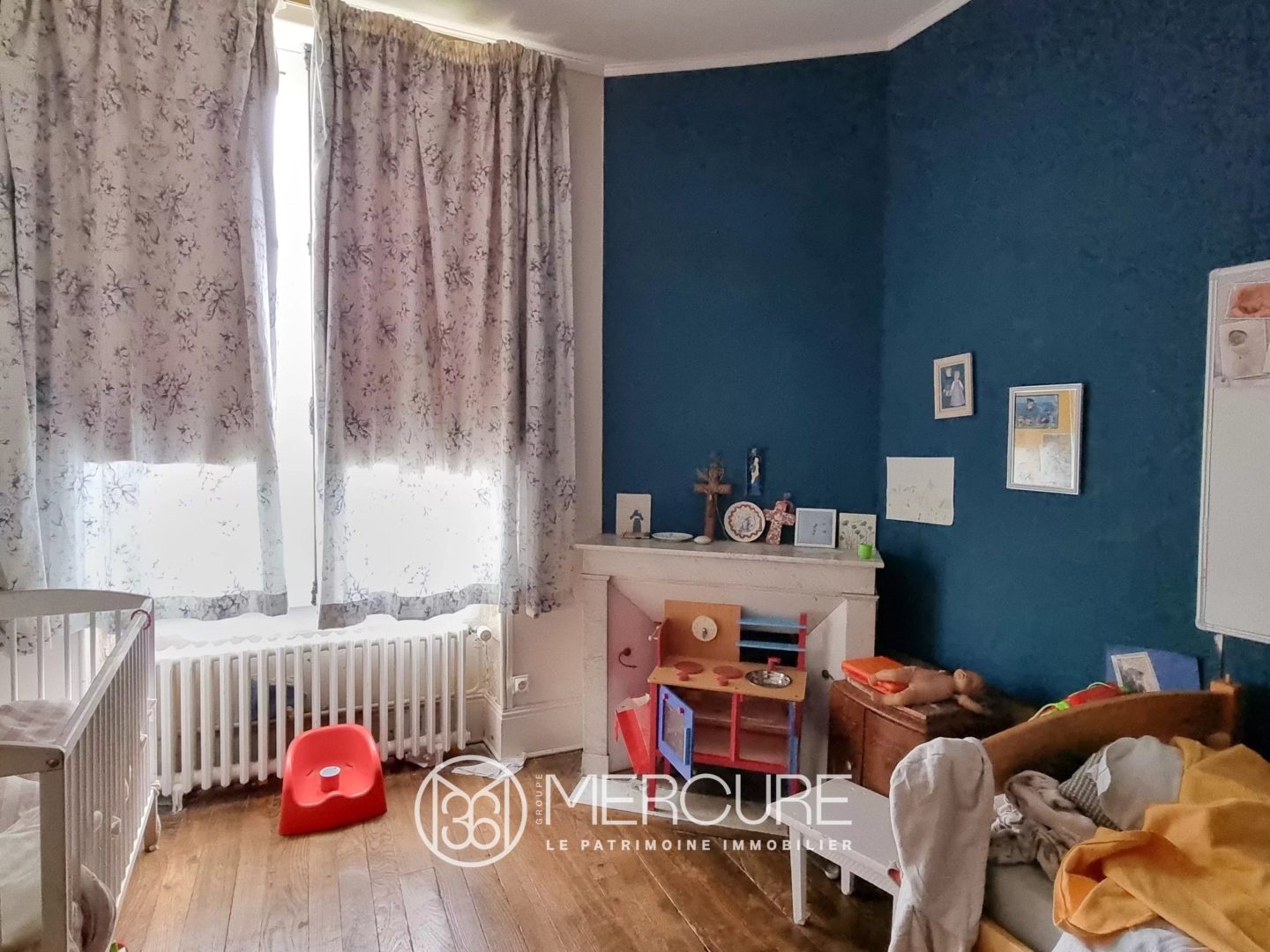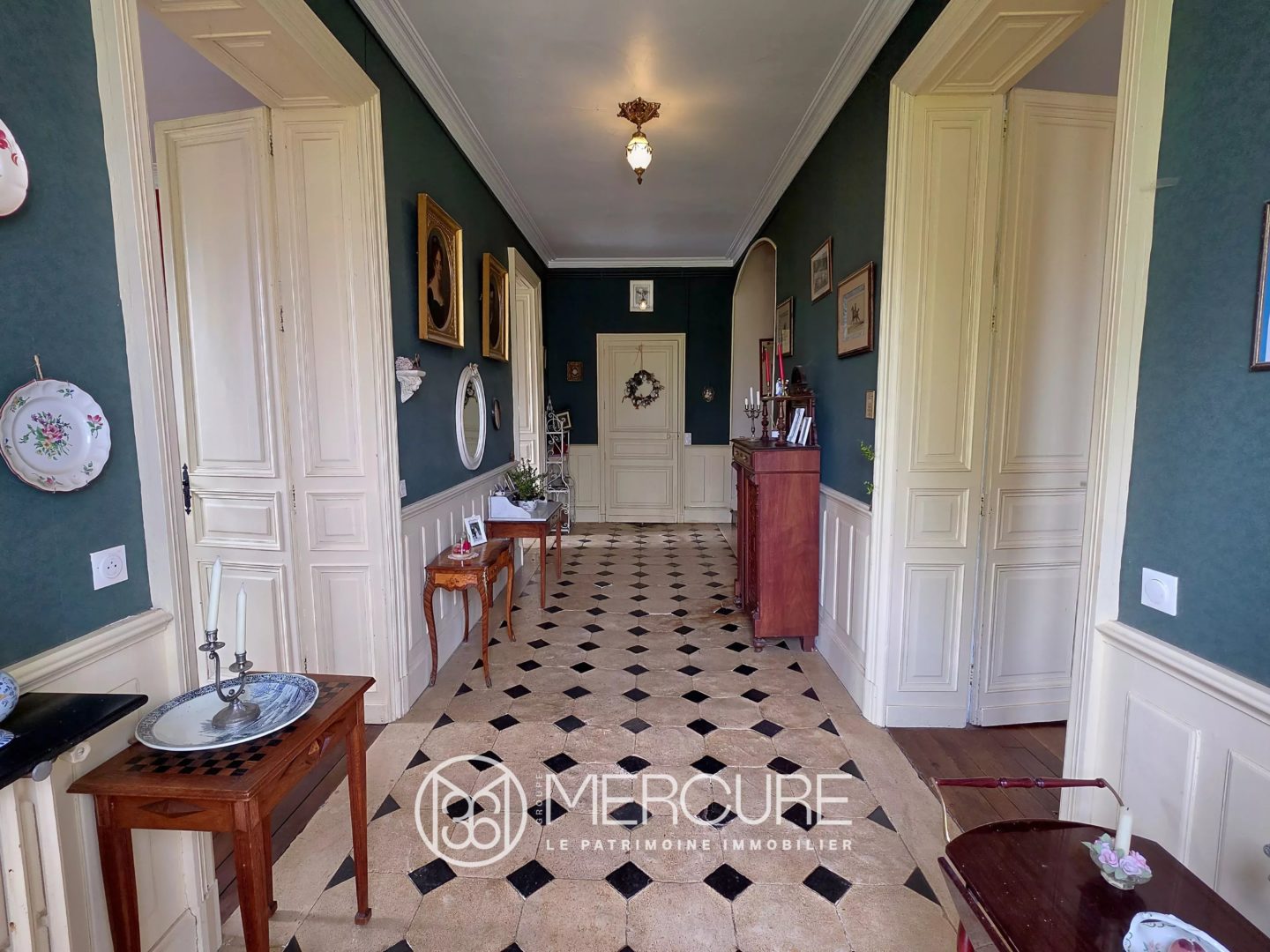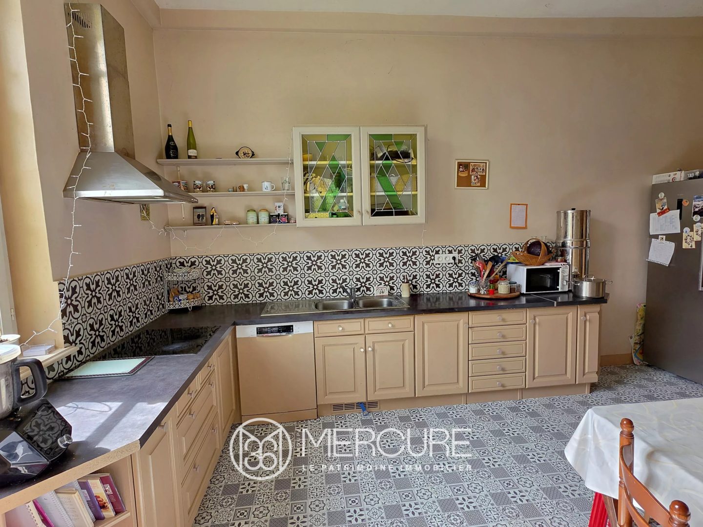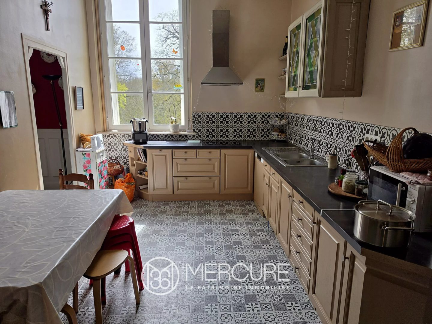 Dès l’entrée, les pavés d’origine racontent l’histoire des lieux et conduisent vers un salon aux boiseries restaurées, une salle à manger sublimée par ses moulures et une cuisine lumineuse, créant un ensemble harmonieux et accueillant.