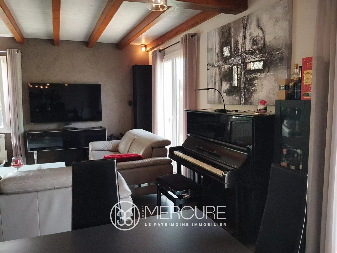 Maison moderne de 220 m² habitables comprenant au rez-de-chaussée : une cuisine équipée de 11 m² ouverte sur un grand salon de 40 m² équipé d’un poêle à bois.