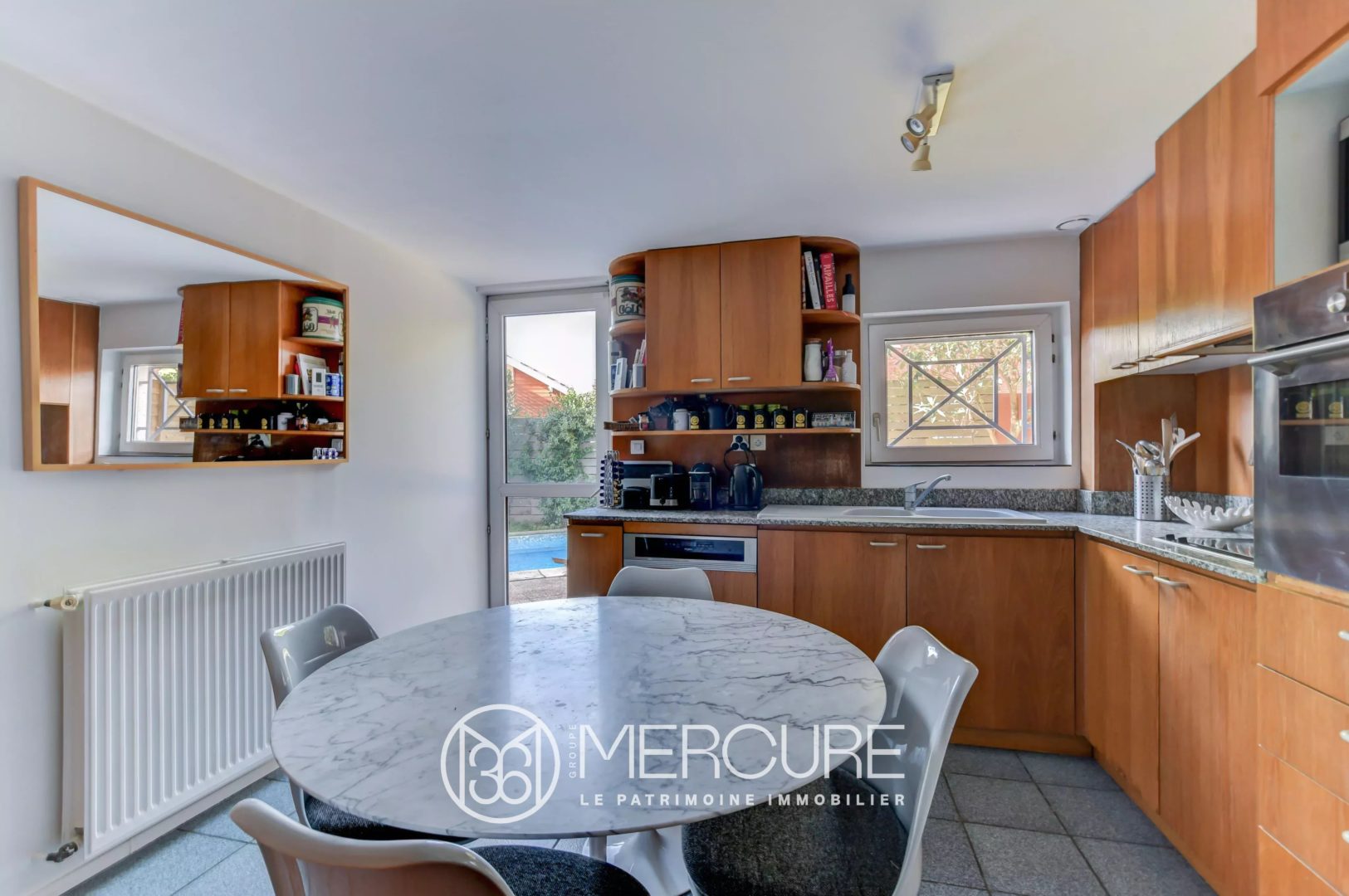 – Salle à manger, cuisine et buanderie, ses trois pièces donnant sur le jardin et sa terrasse dinatoire.