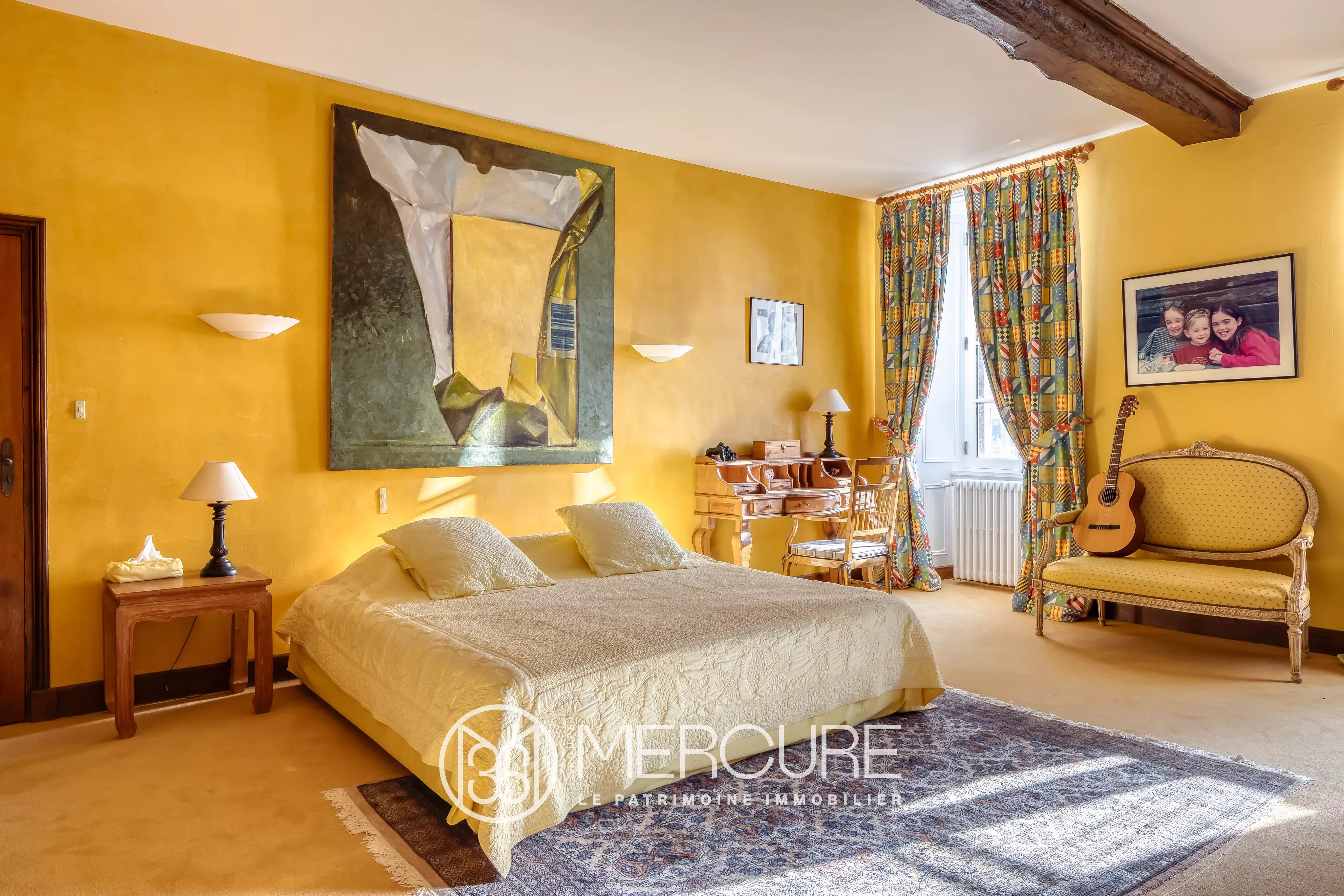 Les aménagements anciens ont été largement préservés, renforçant l’authenticité de l’ensemble. L’hôtel comprend aujourd’hui 11 chambres, dont une chambre monumentale sous combles, avec charpente apparente, salle de bain et dressing.