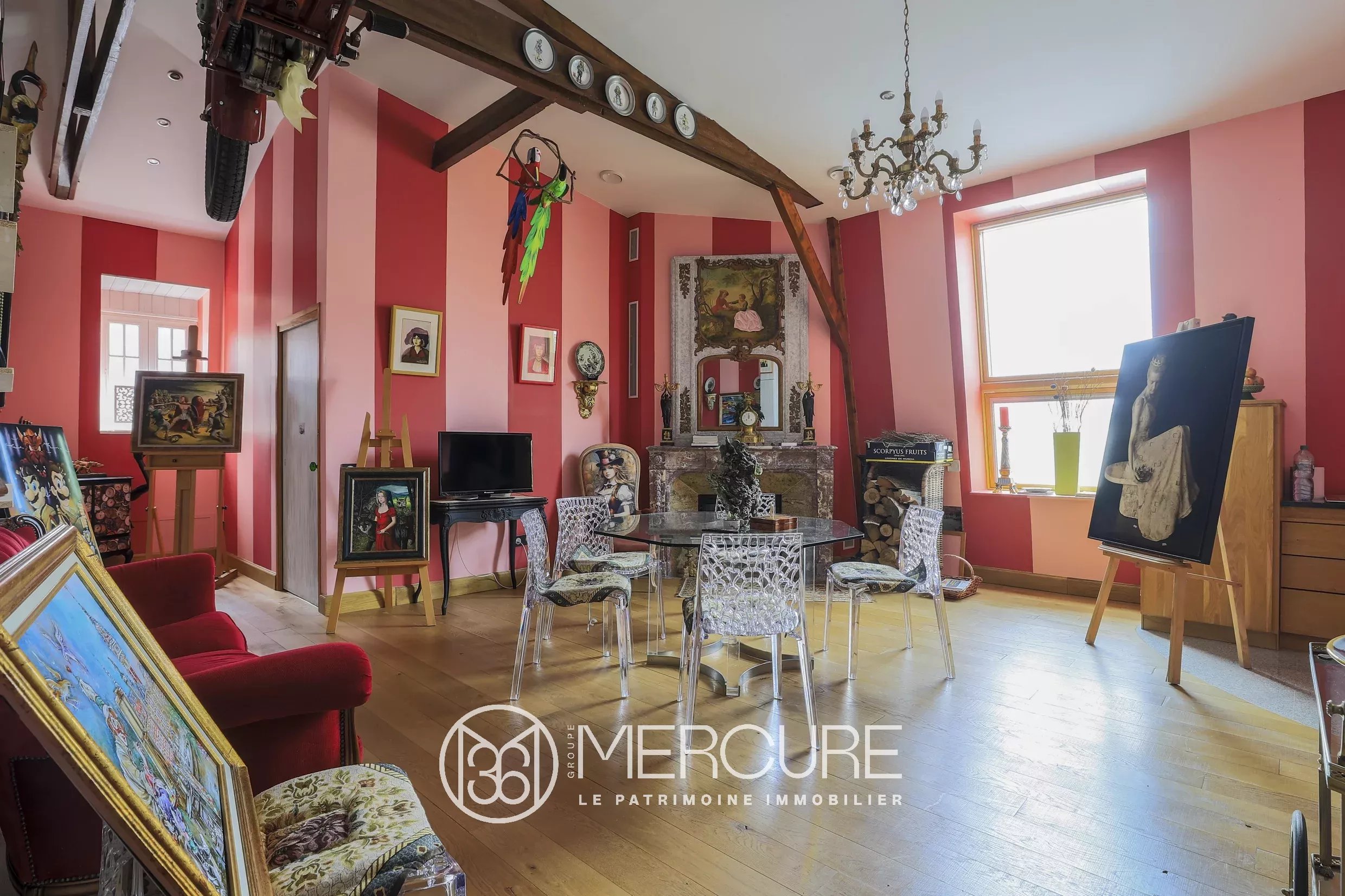 Réparti sur 3 niveaux le bâtiment se développe sur près de 1000 m² habitables et offre en rez-de-chaussée une immense salle de réception de plus de 110 m², de grande hauteur sous plafond, très lumineuse et donnant sur le parc et les ruines de l’ancien couvent, ainsi qu’un fumoir, une cuisine et une arrière-cuisine.