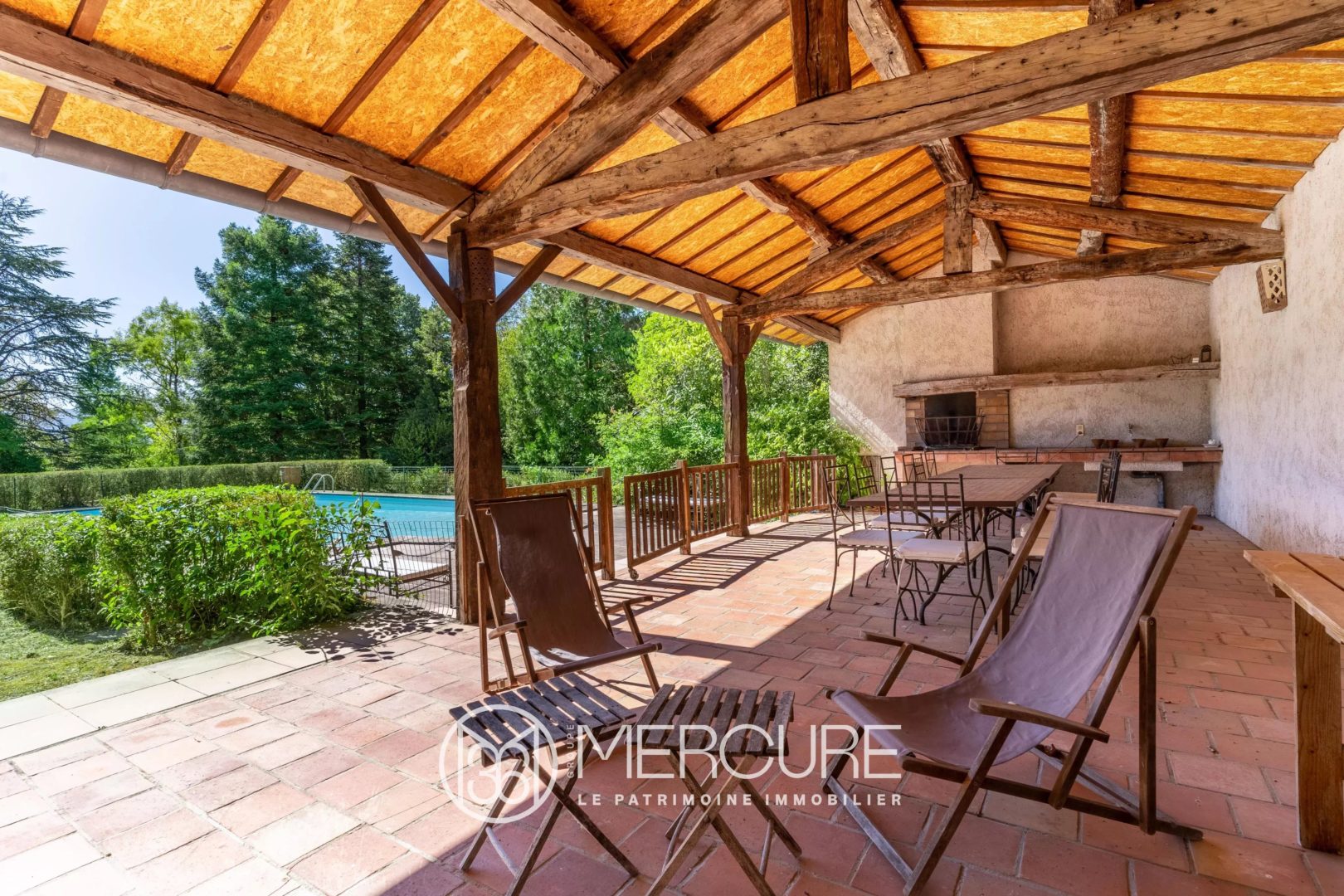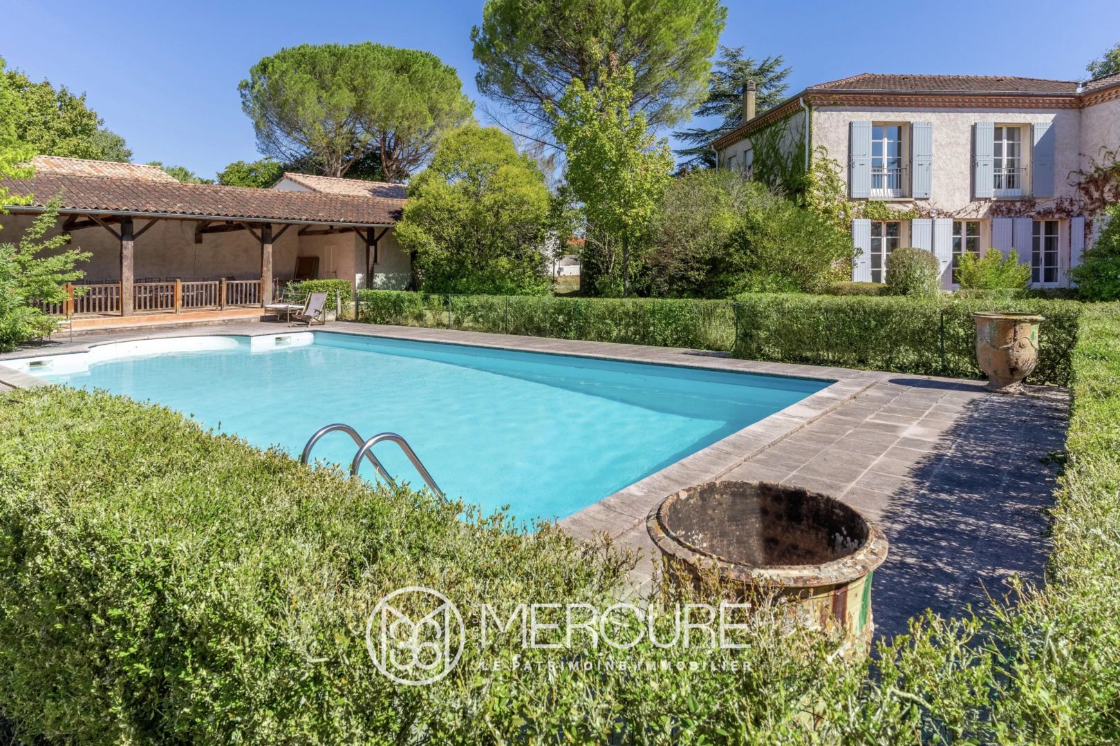 La maison de 250 m2 habitable environ profite d’un parc arboré et clos de 3000 m² où se trouvent une piscine de 12×6 m avec un traitement au sel et son pool house.