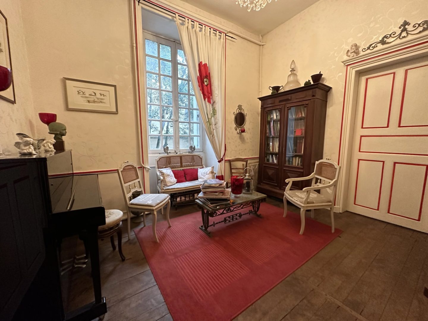 -Salon de musique sur parquet chêne en échelle avec escalier vers étages (12,68 m²)