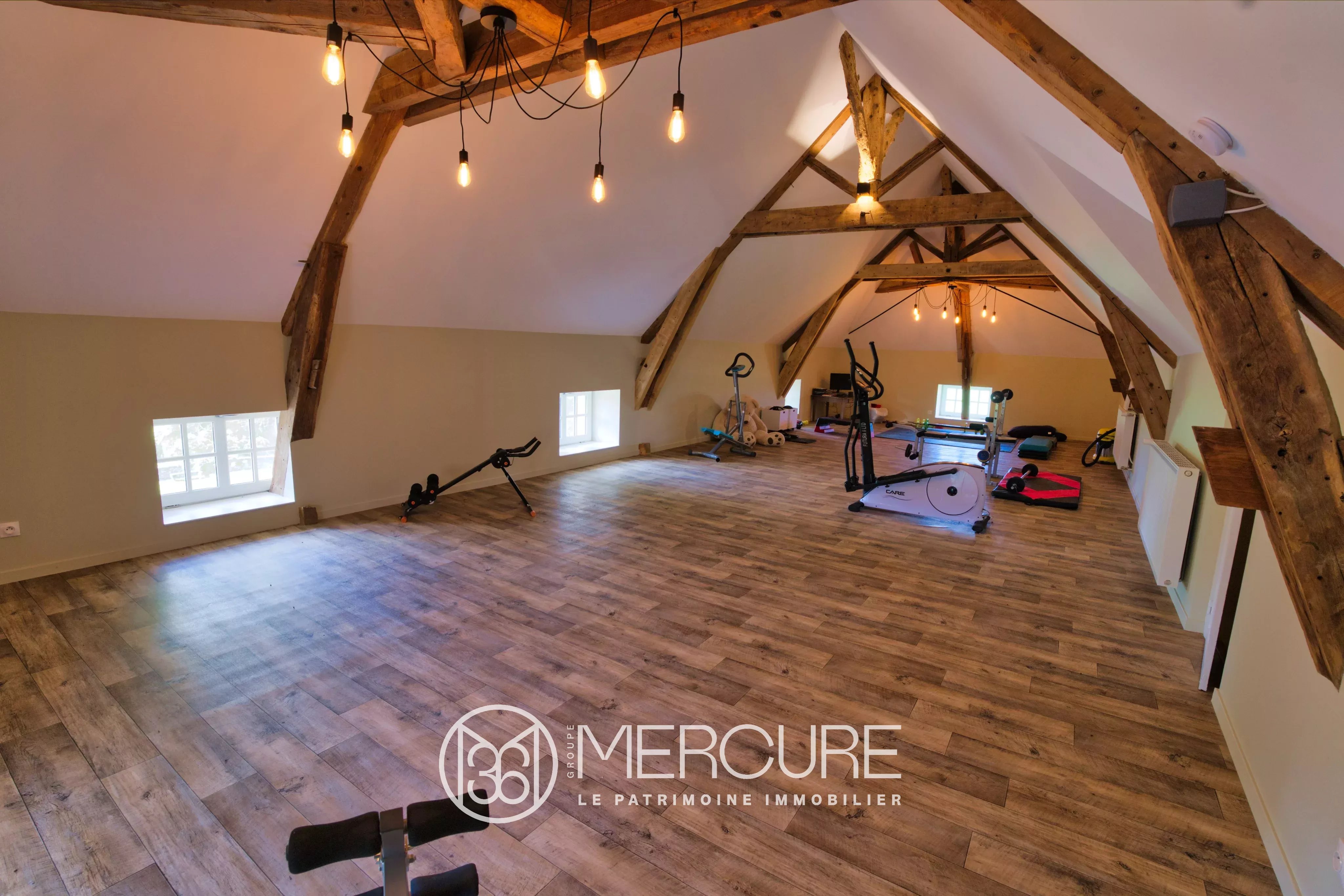 • 2eme étage : palier et grande salle de sport de 81m² sous très belle charpente apparente.