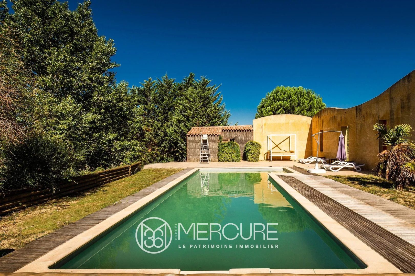 Jardin immense arboré et irrigué avec pompage de l’eau du lac, vue magnifique sans vis-à-vis, grande piscine en 10 x 6 m cachée par un grand mur de la même pierre et son pool-house…