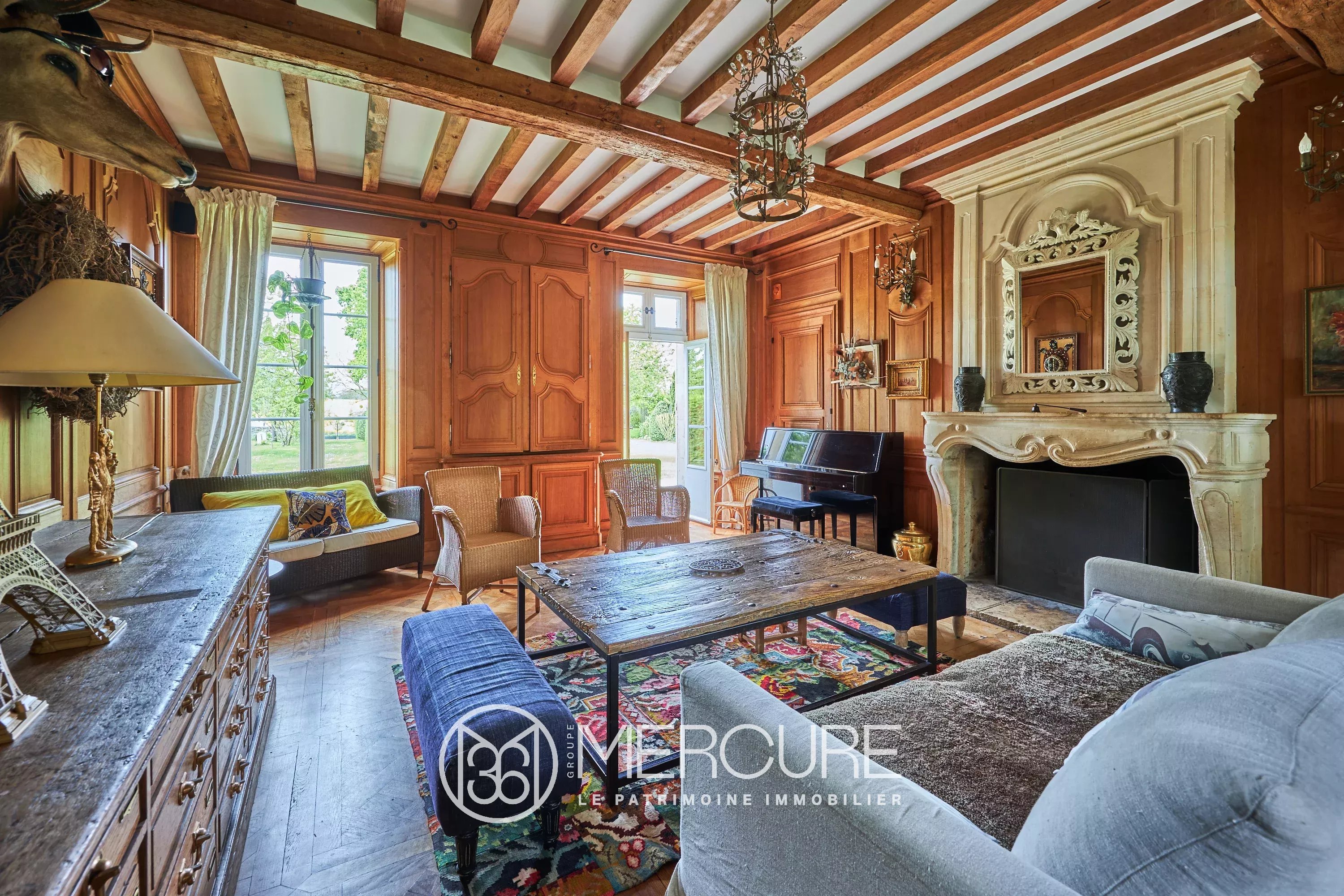 – Sur un sol de tommettes joliment dessiné, on découvre cette belle pièce (29 m² env.) avec de petites boiseries à mi-hauteur ouverte à l’opposé par une large baie vitrée et son autre terrasse.