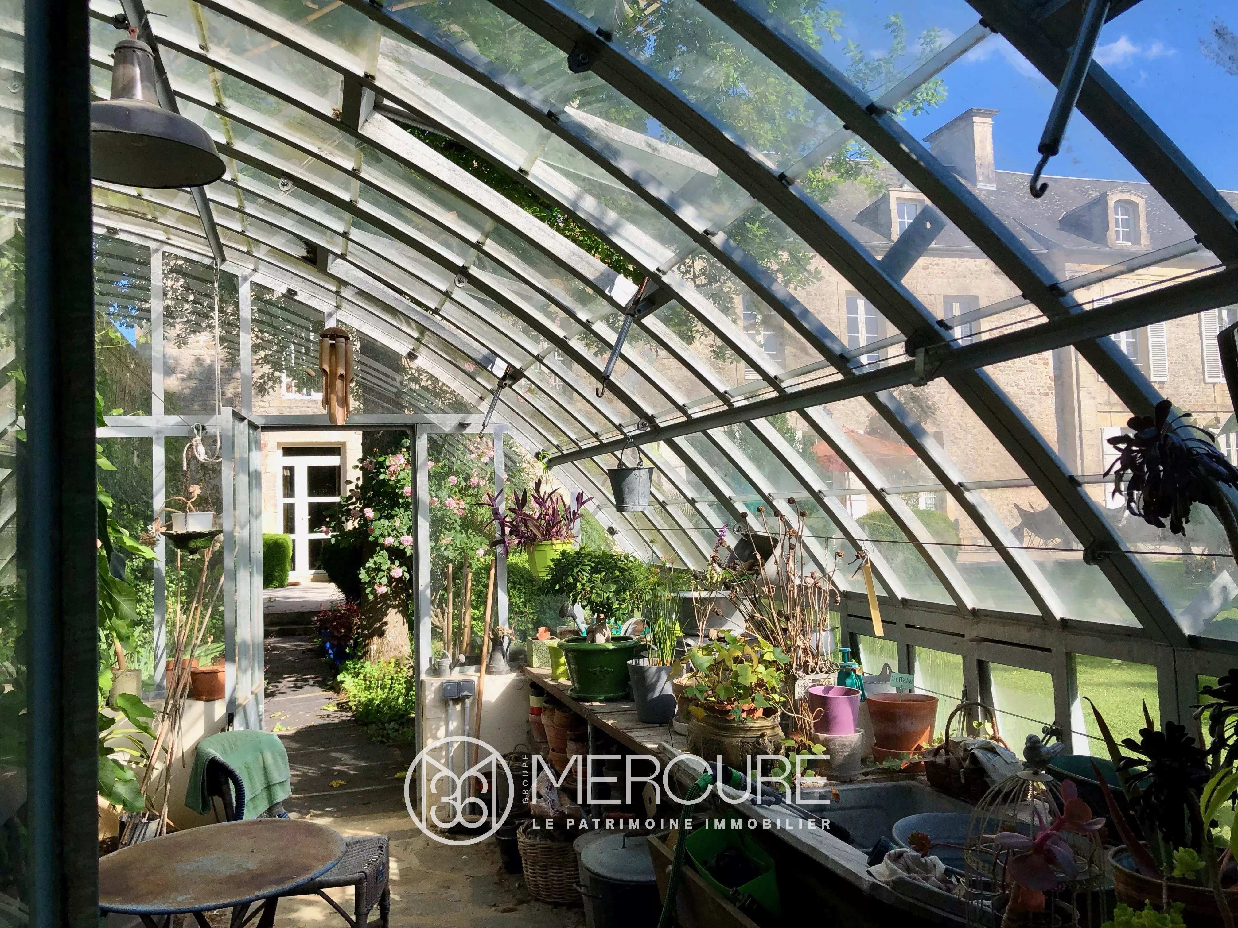A l’arrière, le terrain est coupé en deux par une longue haie de buis laissant d’un côté une partie verger et à droite une superbe espace de pelouse. On admire la serre récente conçue sur un modèle d’époque pour les préparations d’hiver de ce jardin précieux. Les arbustes taillés en topiaire et la terrasse sont tournés vers la vue dégagée au-delà du jardin.