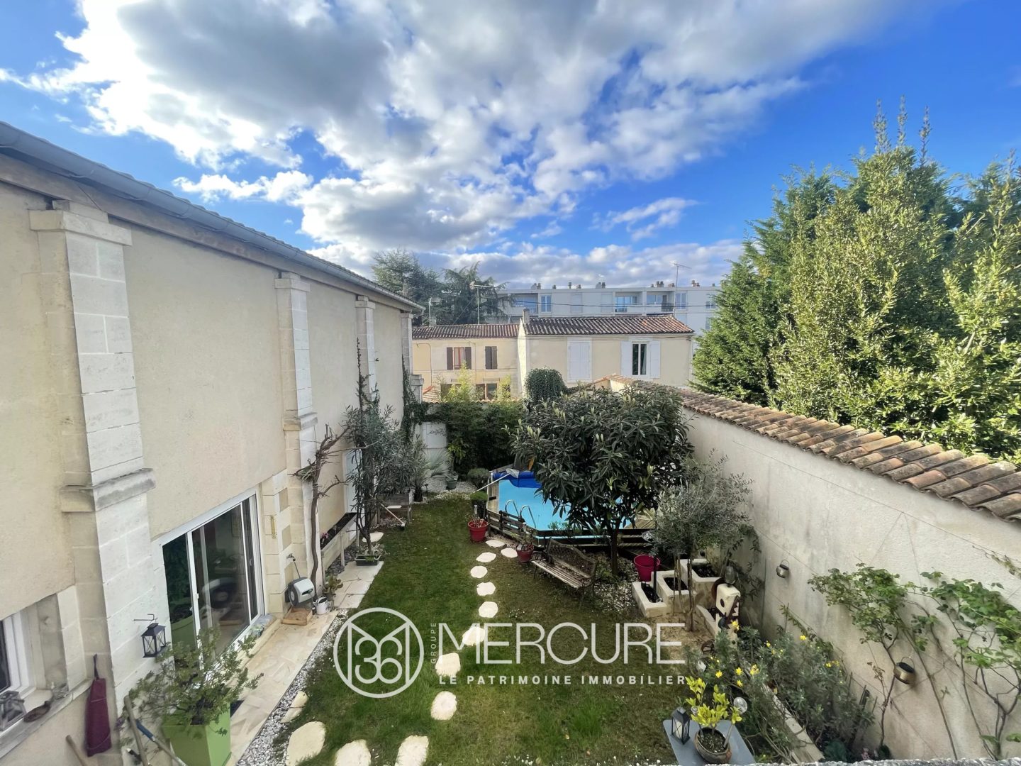 Sur une parcelle de 464 m², la partie habitation de 370 m² est divisée en plusieurs parties. Elle est accompagnée d’un ravissant jardin avec une piscine chauffée (chlore, pompe à chaleur) (3,50 x 4,50m, prof. 1,30m) et de jolis arbres : néflier du japon, palmier, abricotier, laurier-rose et lavande.
