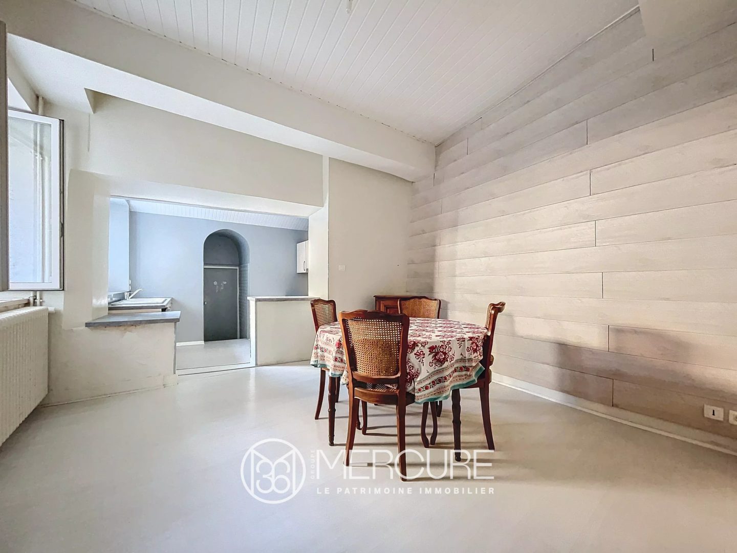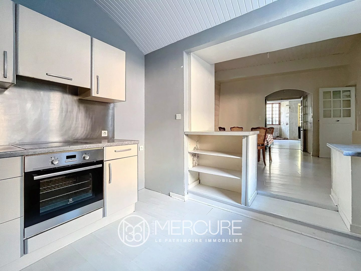 Cette pièce communique par une double porte avec un sas (toilettes), avec la salle à manger, puis la cuisine aménagée et la chaufferie-cellier, et enfin une ancienne cave voûtée.