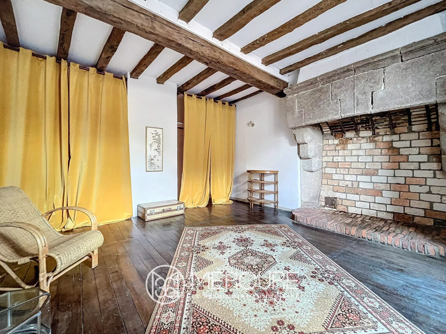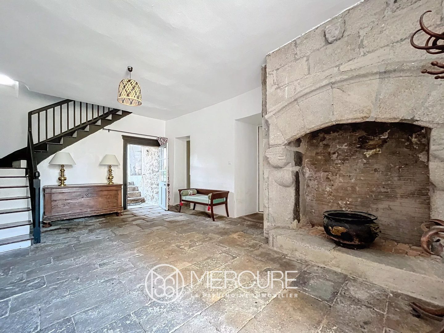 Les lieux se composent comme suit : l’entrée est vaste, avec ses dalles en pierres au sol et sa cheminée en granit monumentale, et un accès vers la cour intérieure. A gauche, on trouve un bureau, dont les murs présentent d’anciennes boiseries, et des placards dissimulés. A droite, on accède à un salon où l’on retrouve encore une magnifique cheminée en granit fonctionnelle, des poutres, et de nombreux détails qui font le charme des lieux.