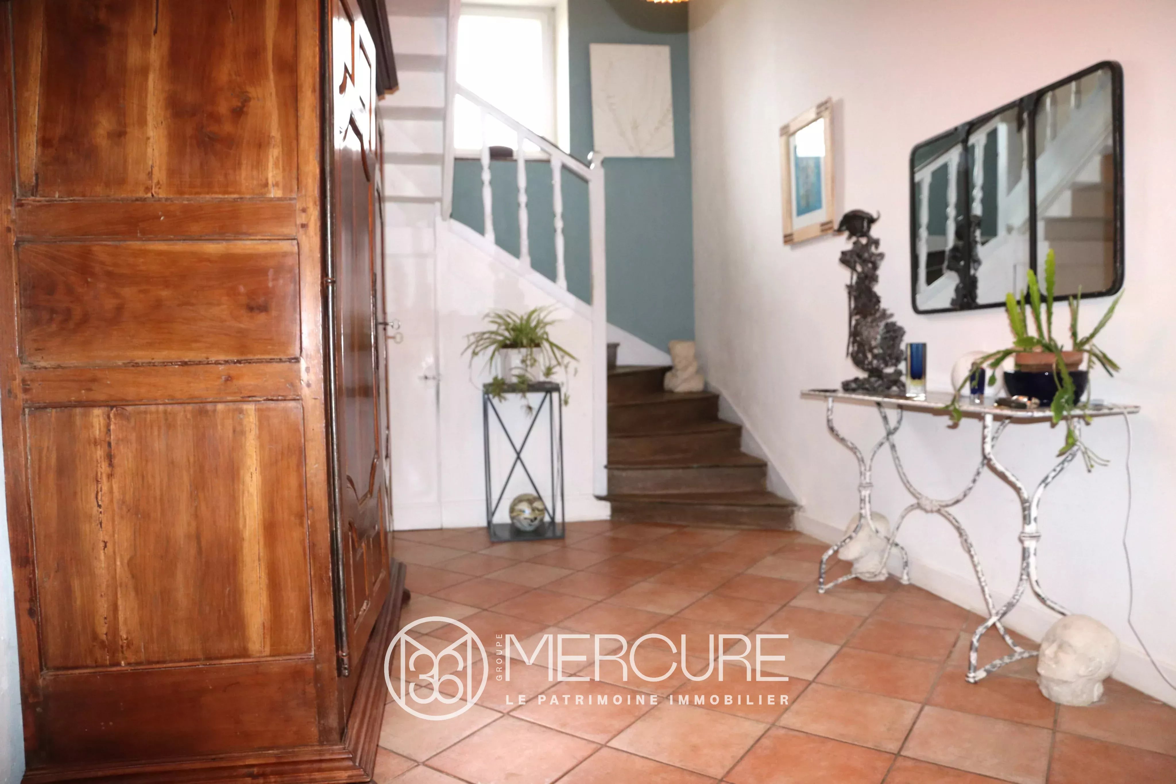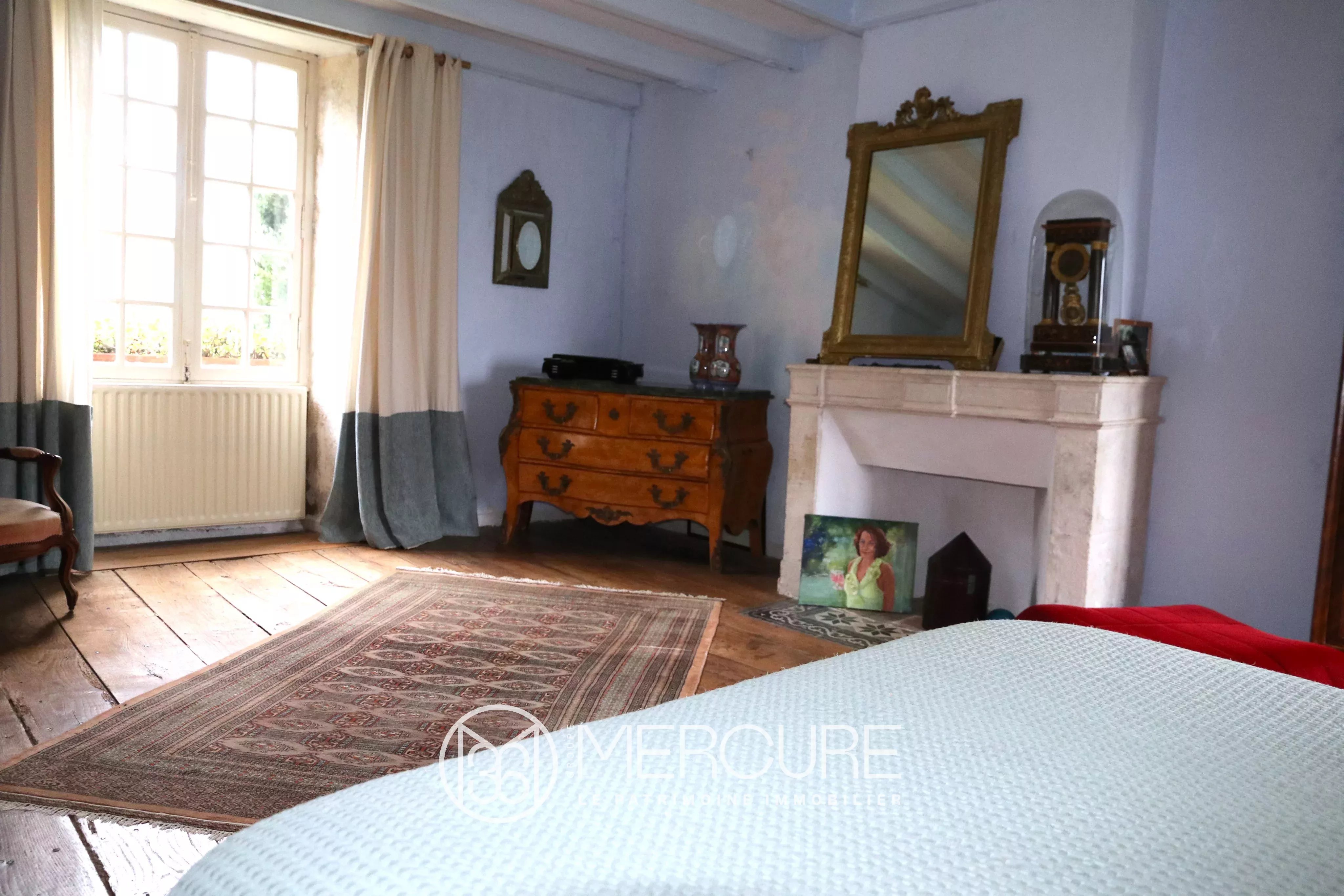 La maison principale comprend en rez-de-chaussée une entrée avec escalier en bois (17 m²) et WC, un salon sur carrelage avec cheminée (27 m²), une cuisine/salle à manger (36 m²) sur dallage pierre et carrelage, et une arrière-cuisine et chaufferie (17 m²). De l’autre côté de l’entrée, vous trouverez un bureau sur parquet chêne avec cheminée et poêle (30 m²), une véranda sur carrelage (34 m²), et un garage/atelier attenant à la véranda.