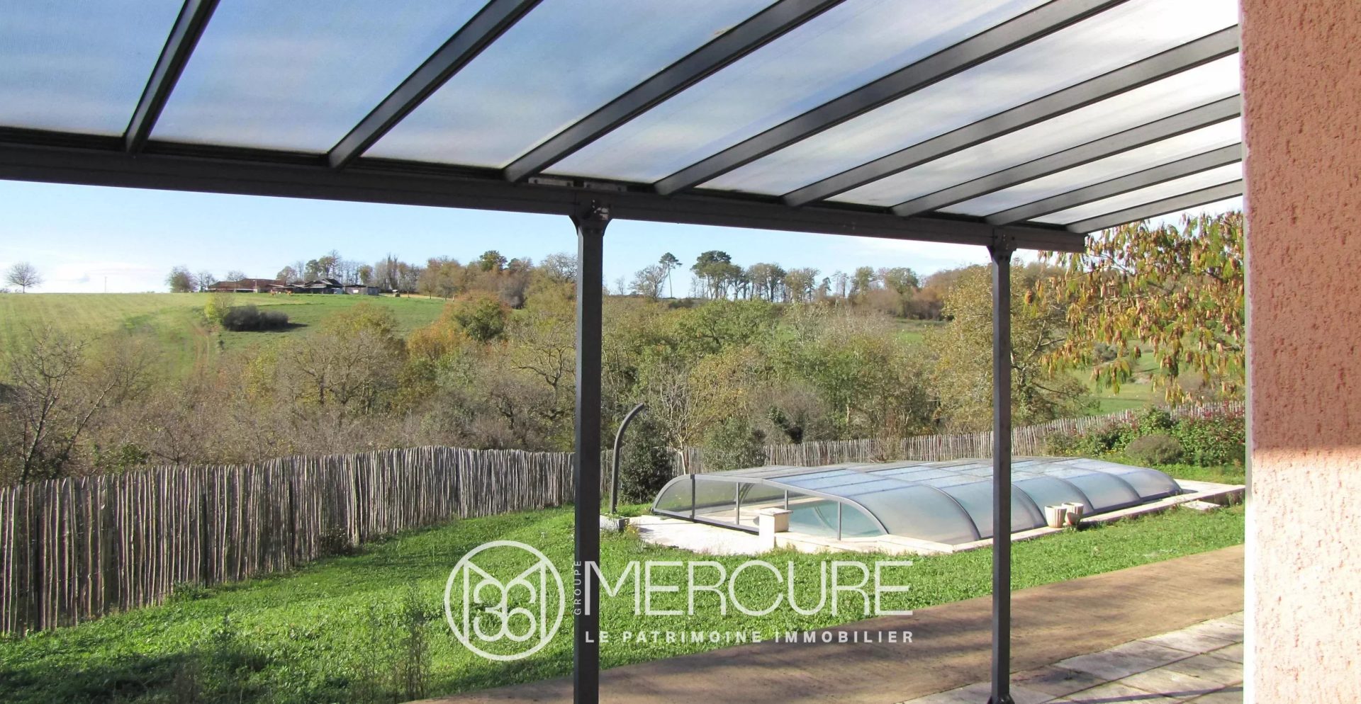 A l’extérieur, une terrasse en partie couverte offre une vue agréable sur le jardin, la piscine au sel avec couverture rétractable.