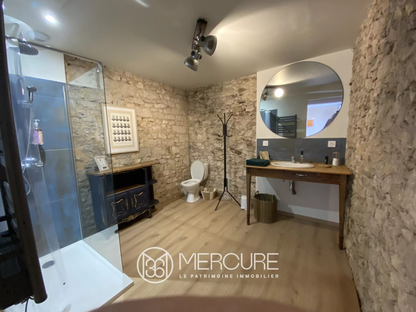 – Salle d’eau privative avec toilettes (9 m²), parquet et pierres apparentes