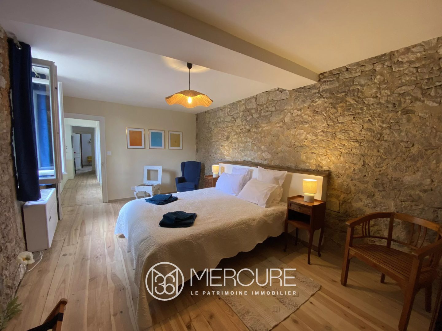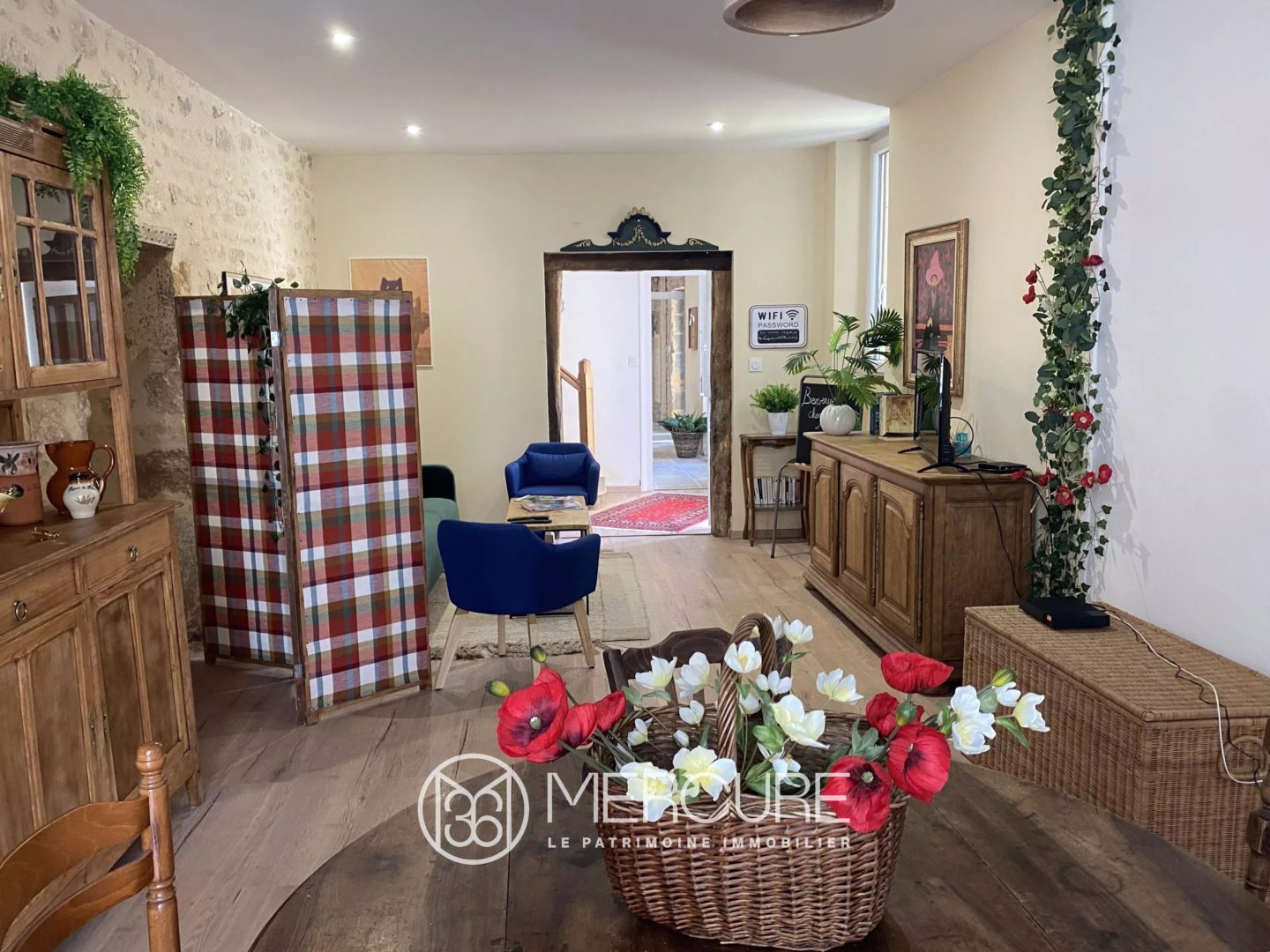 – Séjour lumineux (41.8 m²), parquet, murs en pierres apparentes