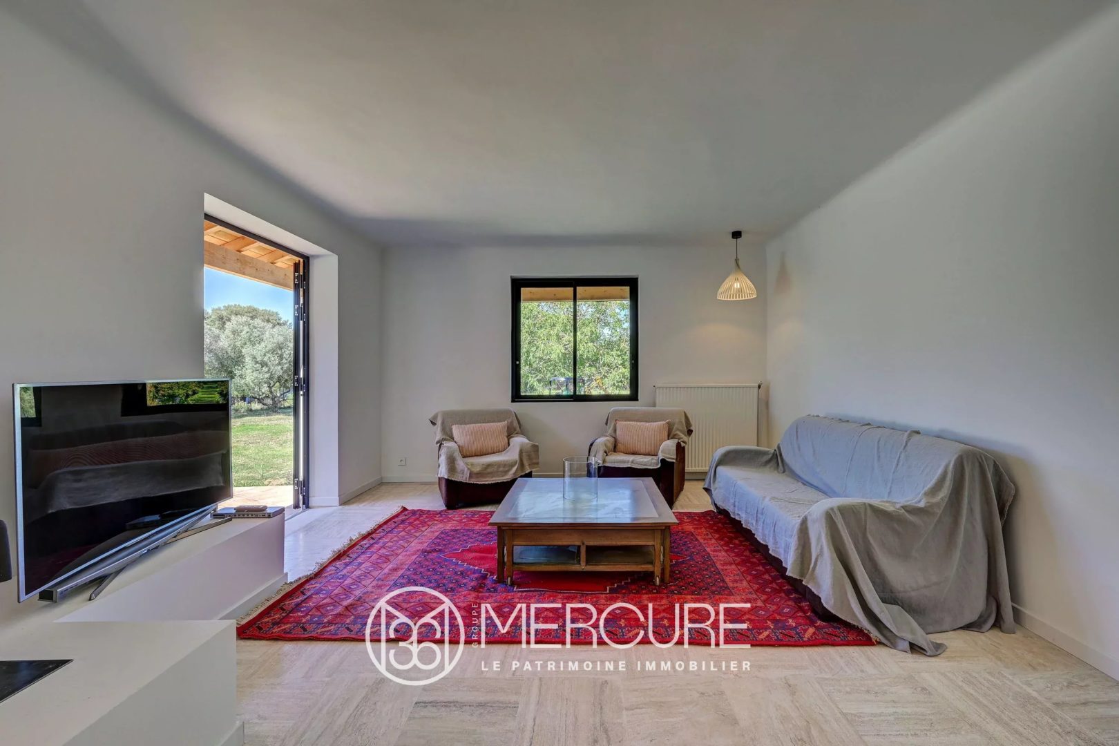 Isolation renforcée, menuiseries en acier, baies vitrées ouvrant sur la terrasse.