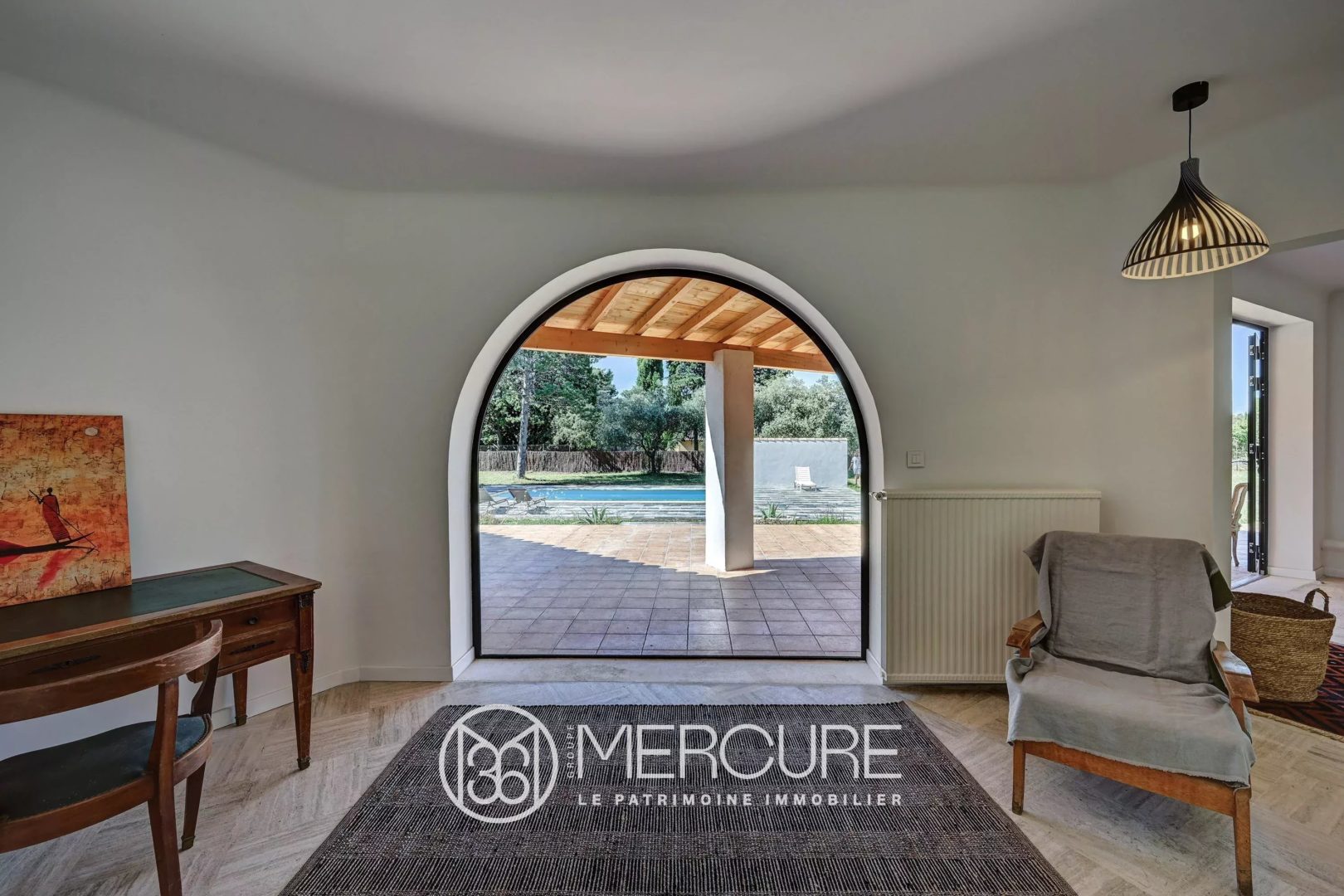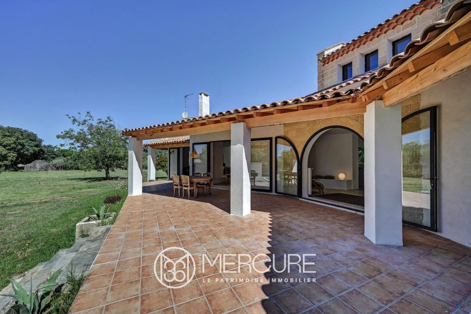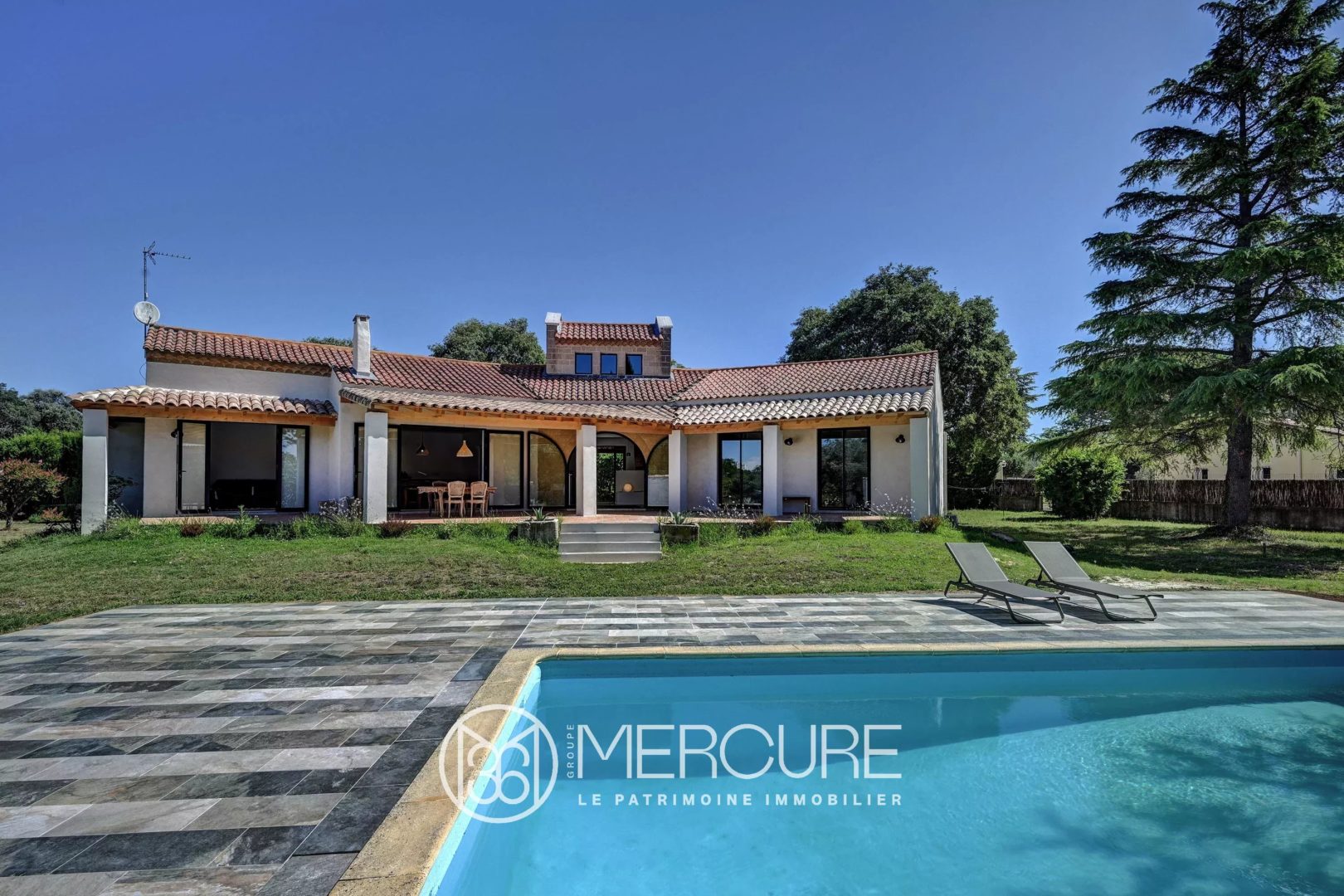 L’extérieur séduit par une vaste terrasse de 100 m² partiellement couverte, idéale pour profiter de moments en plein air autour d’un espace salon-salle à manger d’été. La terrasse s’étend vers une piscine (8,5 x 4 m) et une grande plage carrelée garantissant l’intimité.