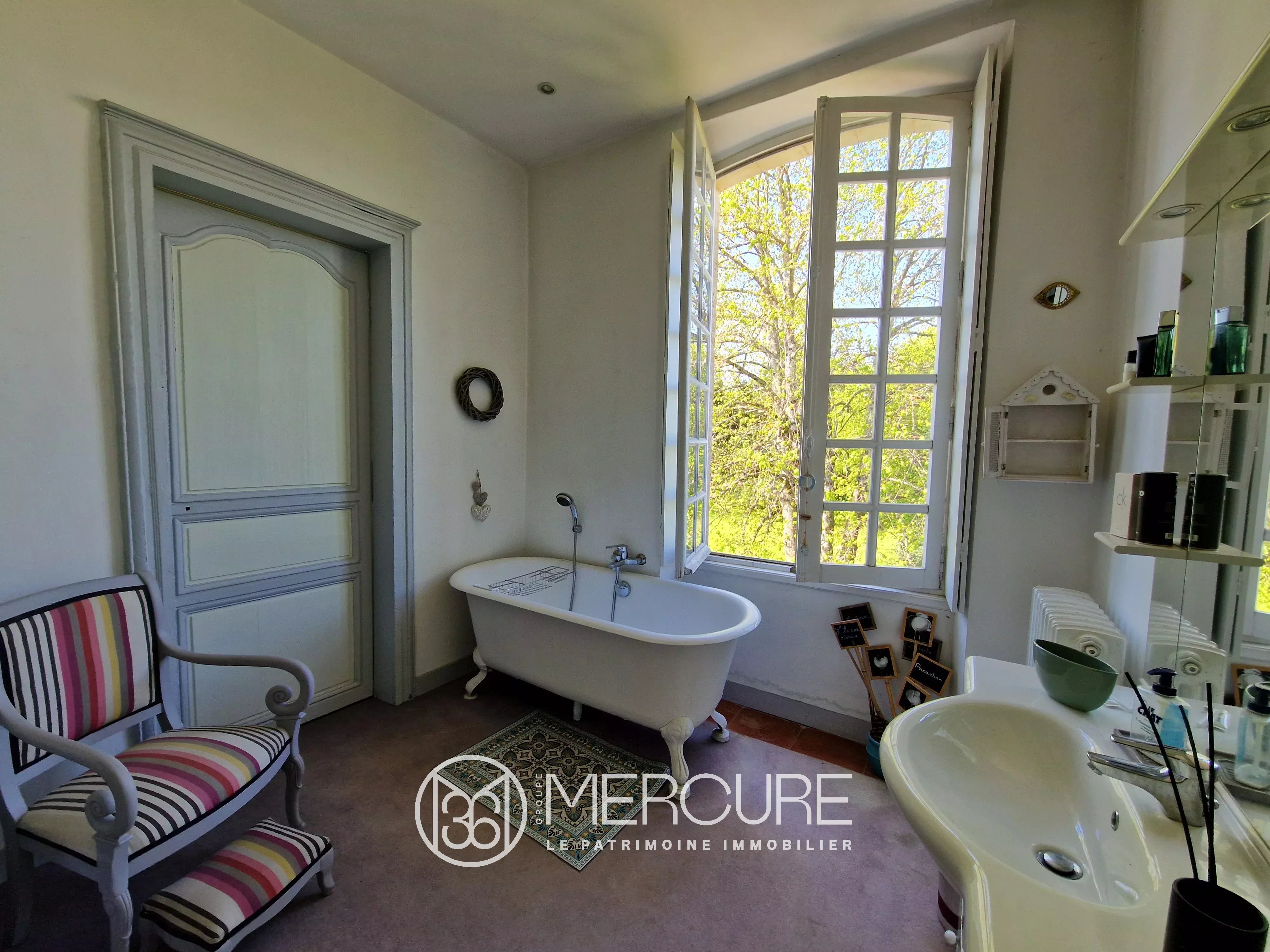 A gauche, une très belle salle à manger (38 m²) est équipée d’un élégant vaisselier d’origine encadrant une cheminée en marbre sculpté; il conduit à une lumineuse et authentique cuisine rustique (38 m²) avec cheminée, carreaux de ciment et murs en moellons.