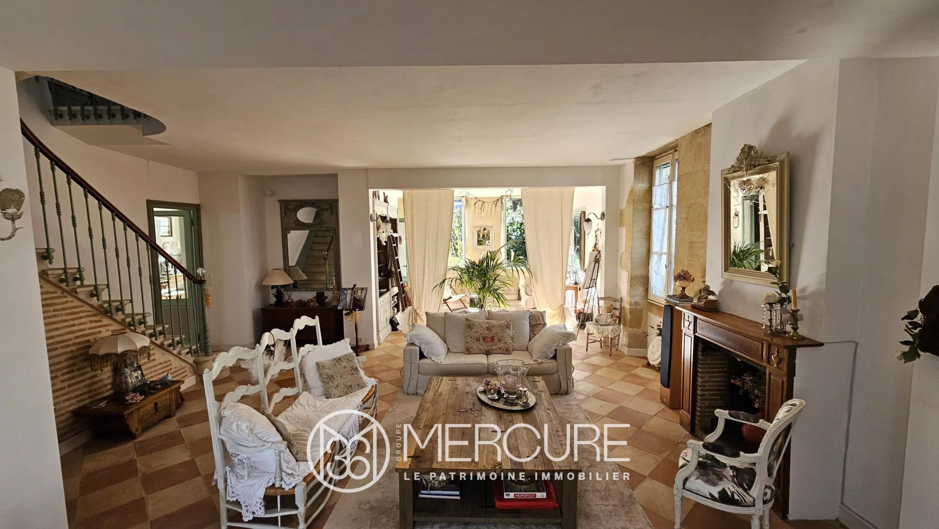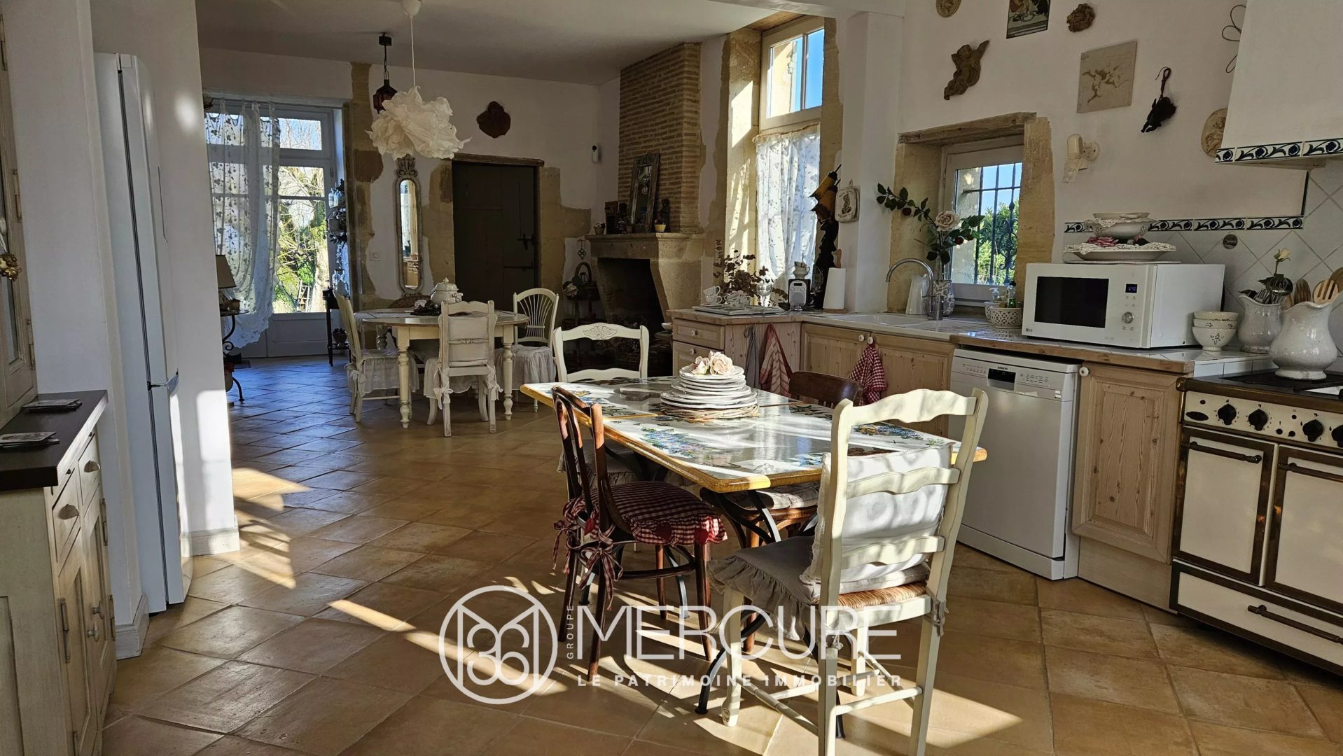 – Salle à manger (20 m²) ouverte sur la cuisine avec cheminée girondine en pierre