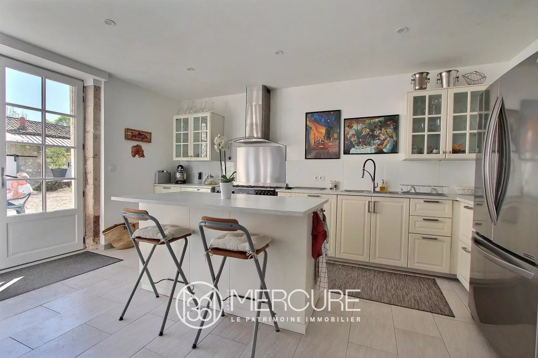 Au calme, la maison ayant gardé son cachet ancien, est très chaleureuse et lumineuse. Elle est composée de quatre chambres, dont trois au rez-de-chaussée, trois salles d’eau, une cuisine lumineuse donnant sur l’extérieur avec une cheminée, une salle à manger, un salon et un bureau et au premier étage, une grande suite parentale et un grenier. Chauffage central au gaz de ville.