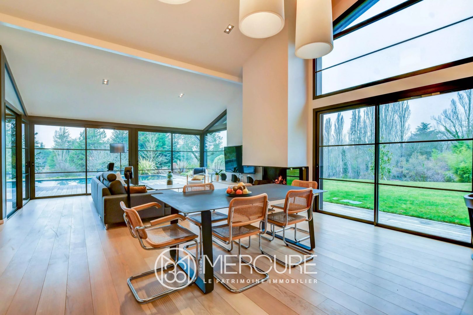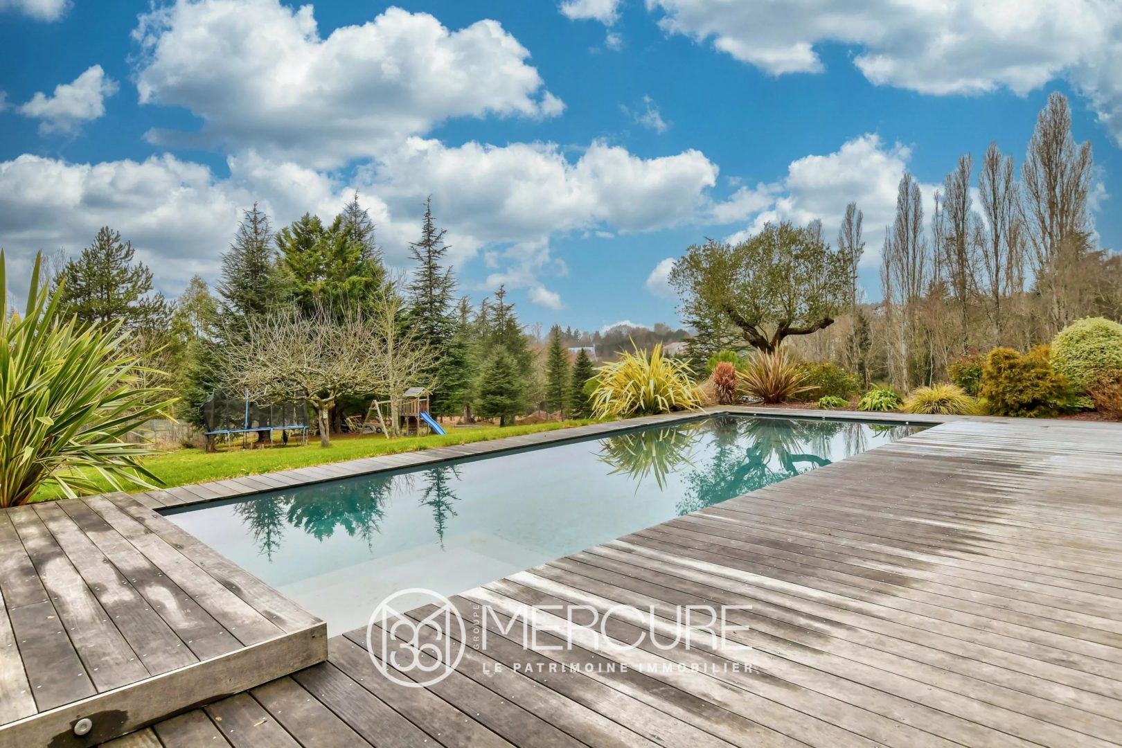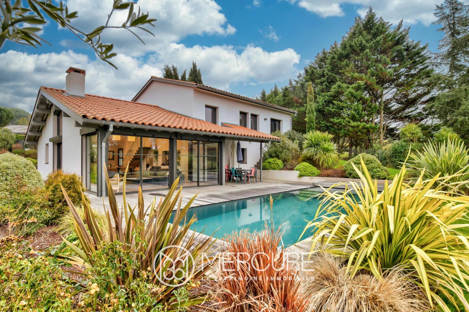 A l’extérieur, la terrasse en ipé promet de belles soirées au bord de la piscine chauffée, surplombant le beau jardin paysagé et arboré.