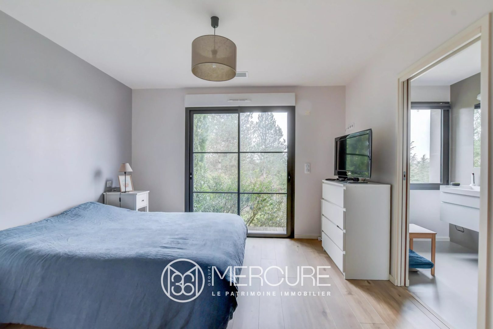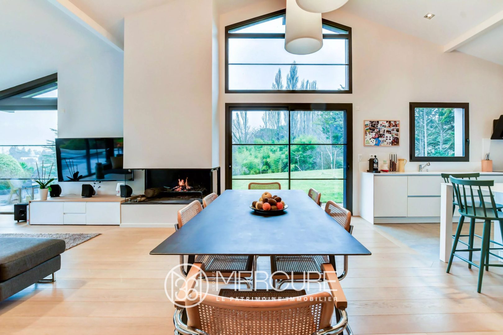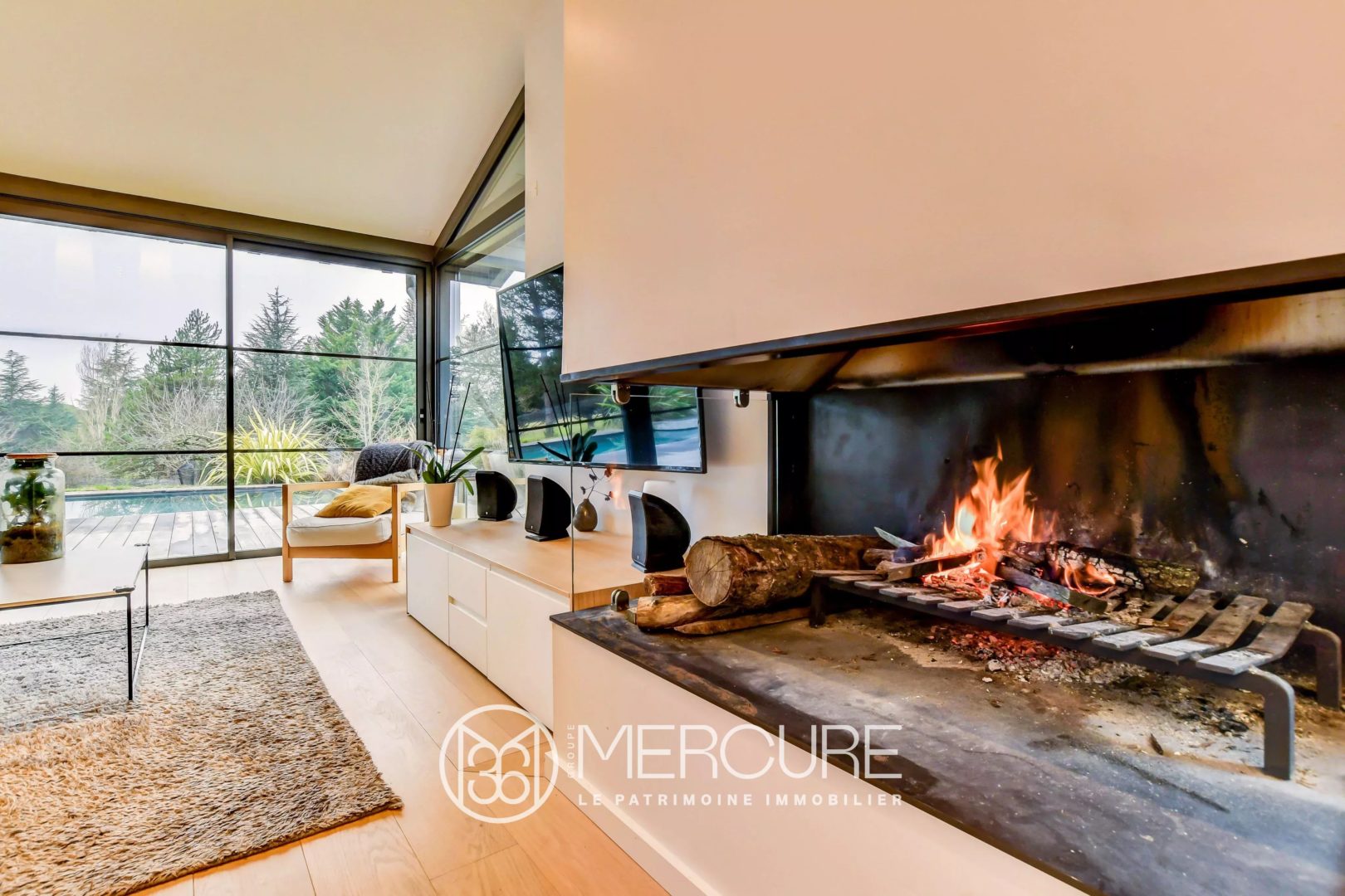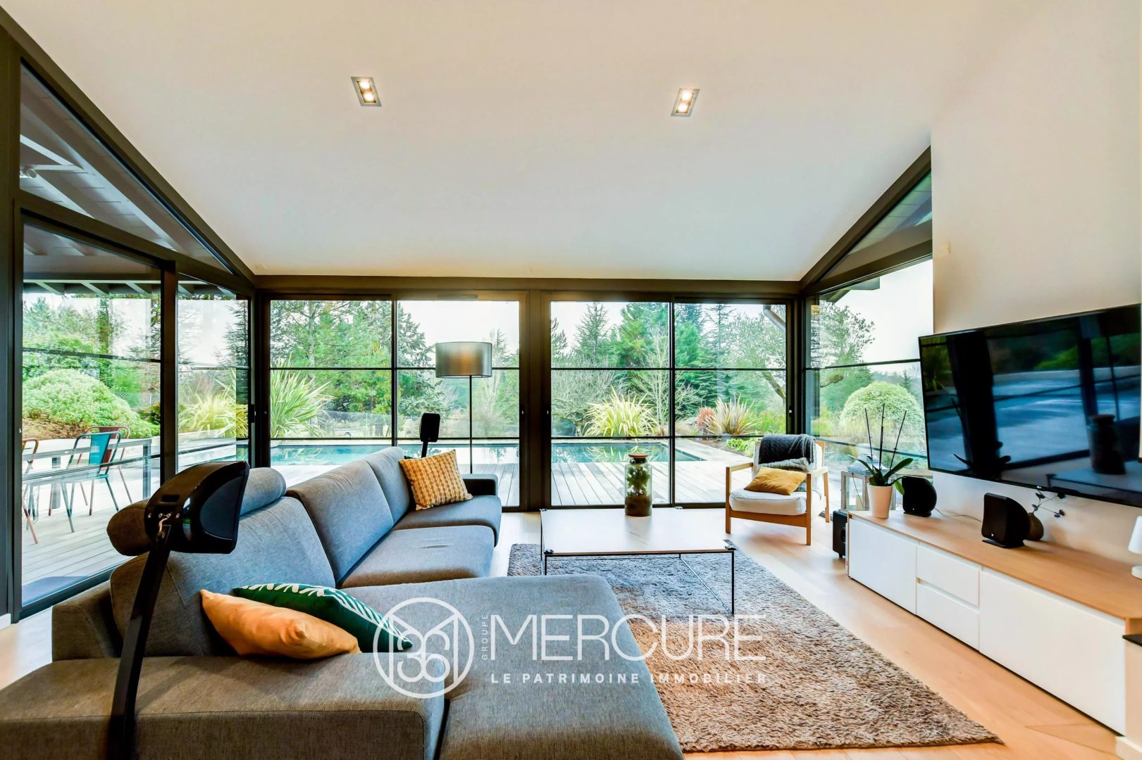 A l’extérieur, la terrasse en ipé promet de belles soirées au bord de la piscine chauffée, surplombant le beau jardin paysagé et arboré.