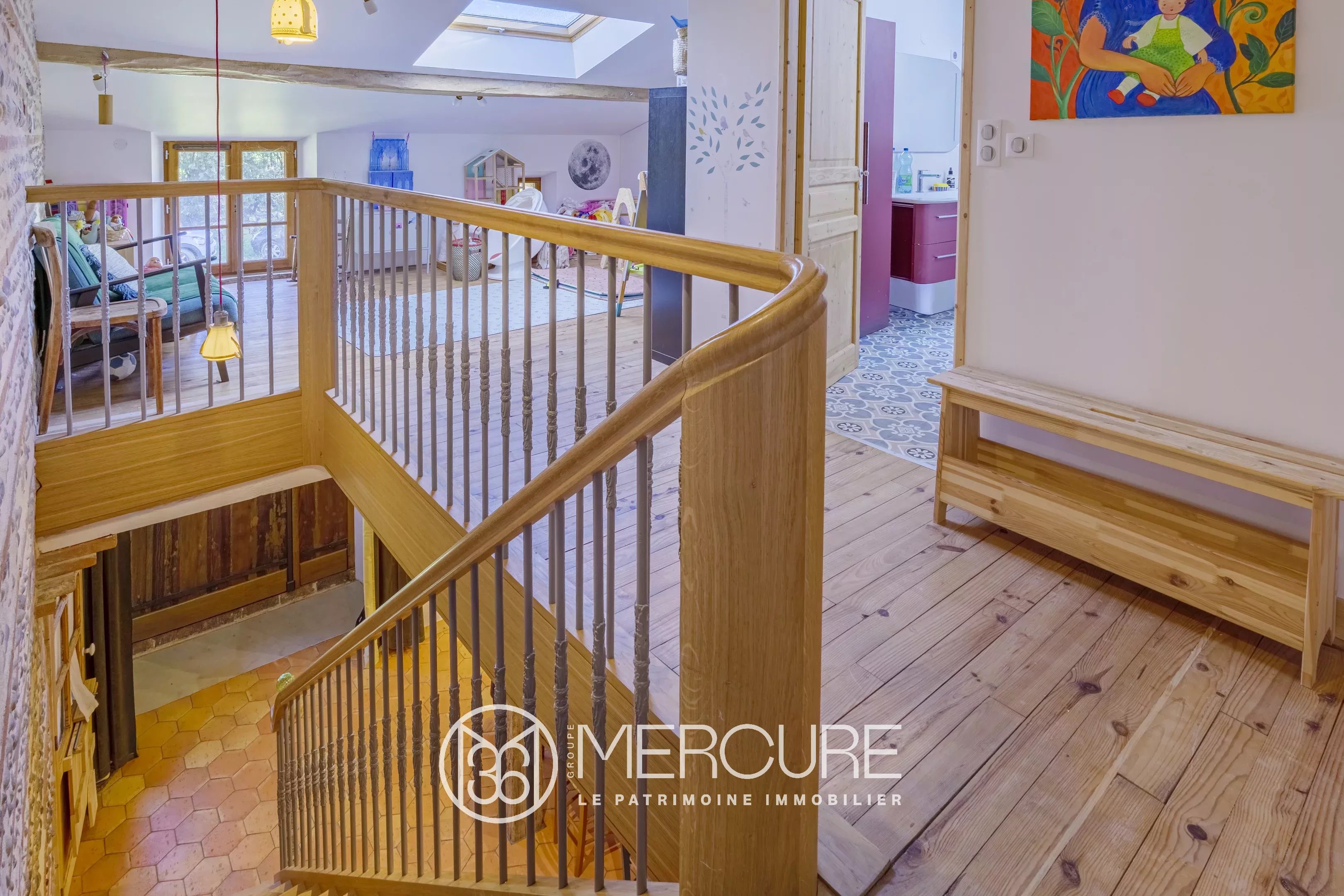 A l’étage, le palier, véritable salle de vie, dessert trois chambres et une salle de douche avec toilettes.