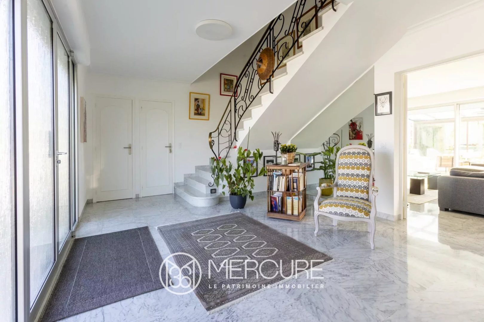Dès l’entrée, un vaste hall lumineux met en valeur les volumes et la noblesse des matériaux, avec un élégant escalier mêlant marbre et fer forgé.