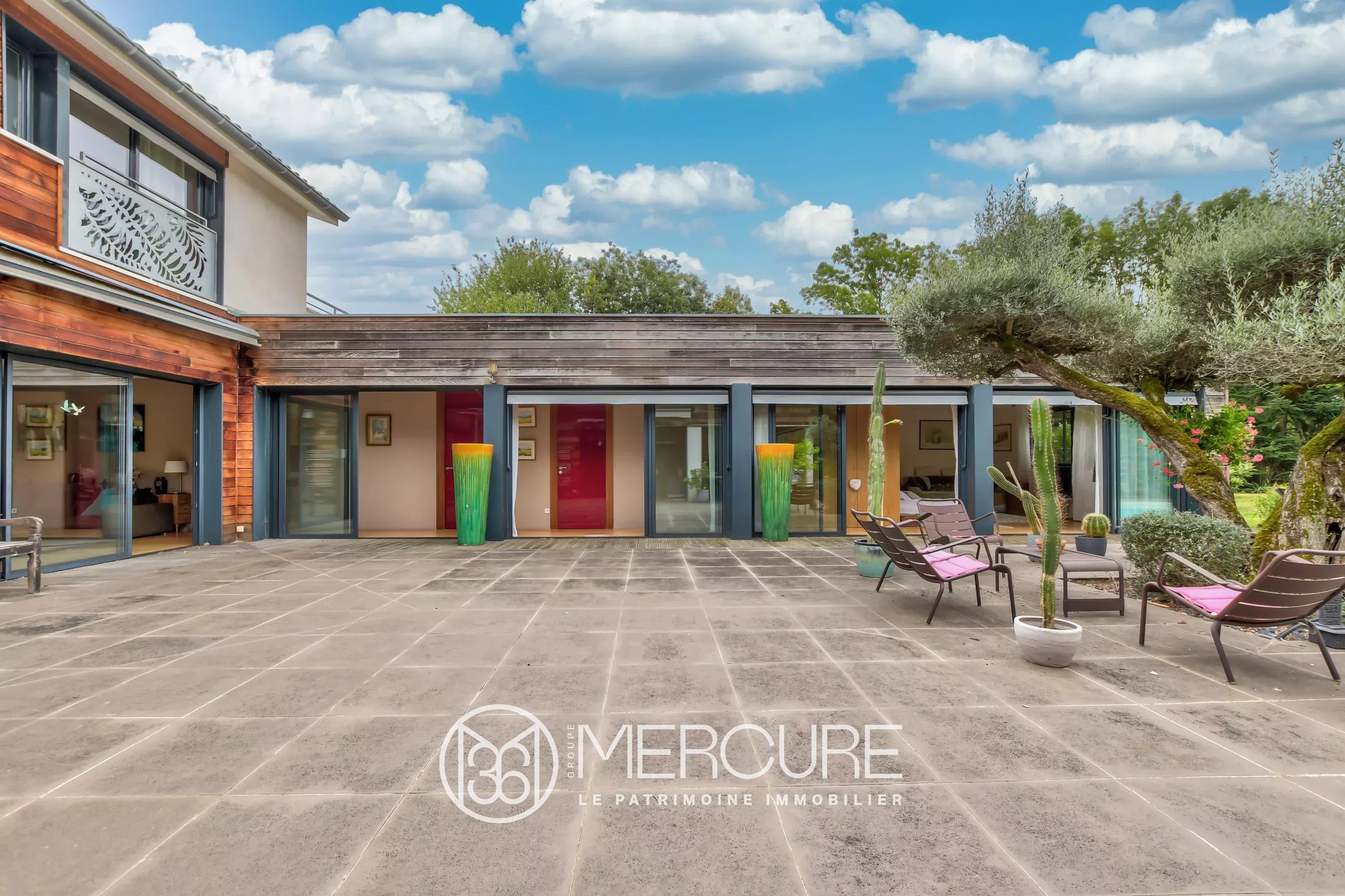 Située à une vingtaine de kilomètres au sud-ouest de Toulouse, au cœur d’un environnement résidentiel calme et parfaitement préservé, cette exceptionnelle villa d’architecte d’environ 300 m² habitables s’organise autour d’un patio central de près de 115 m², véritable cœur lumineux de la maison.