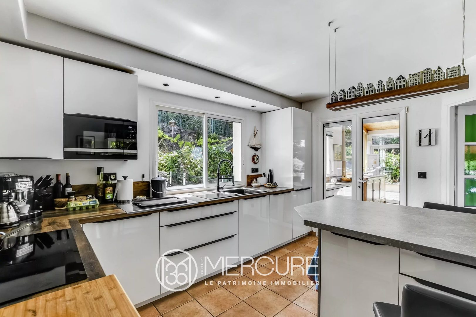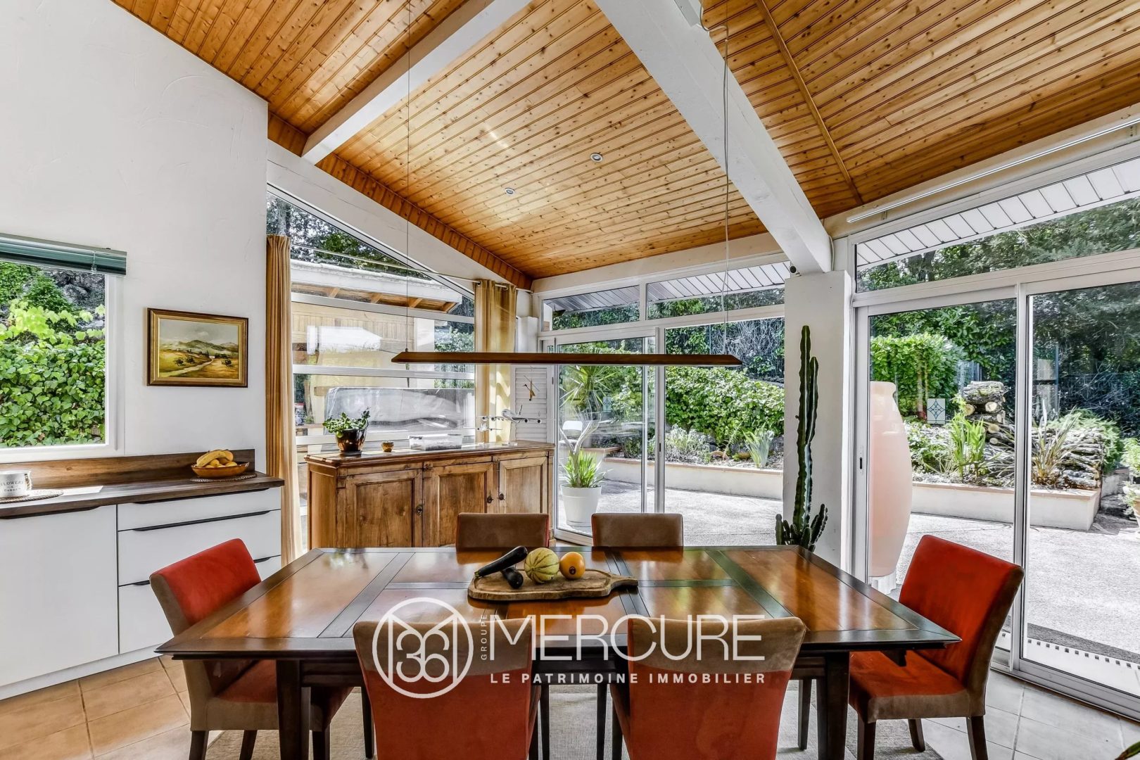 À l’extérieur, la piscine de 9 x 5 m s’intègre parfaitement dans un environnement verdoyant et paysagé, à l’abri de tout vis-à-vis, offrant calme et sérénité.