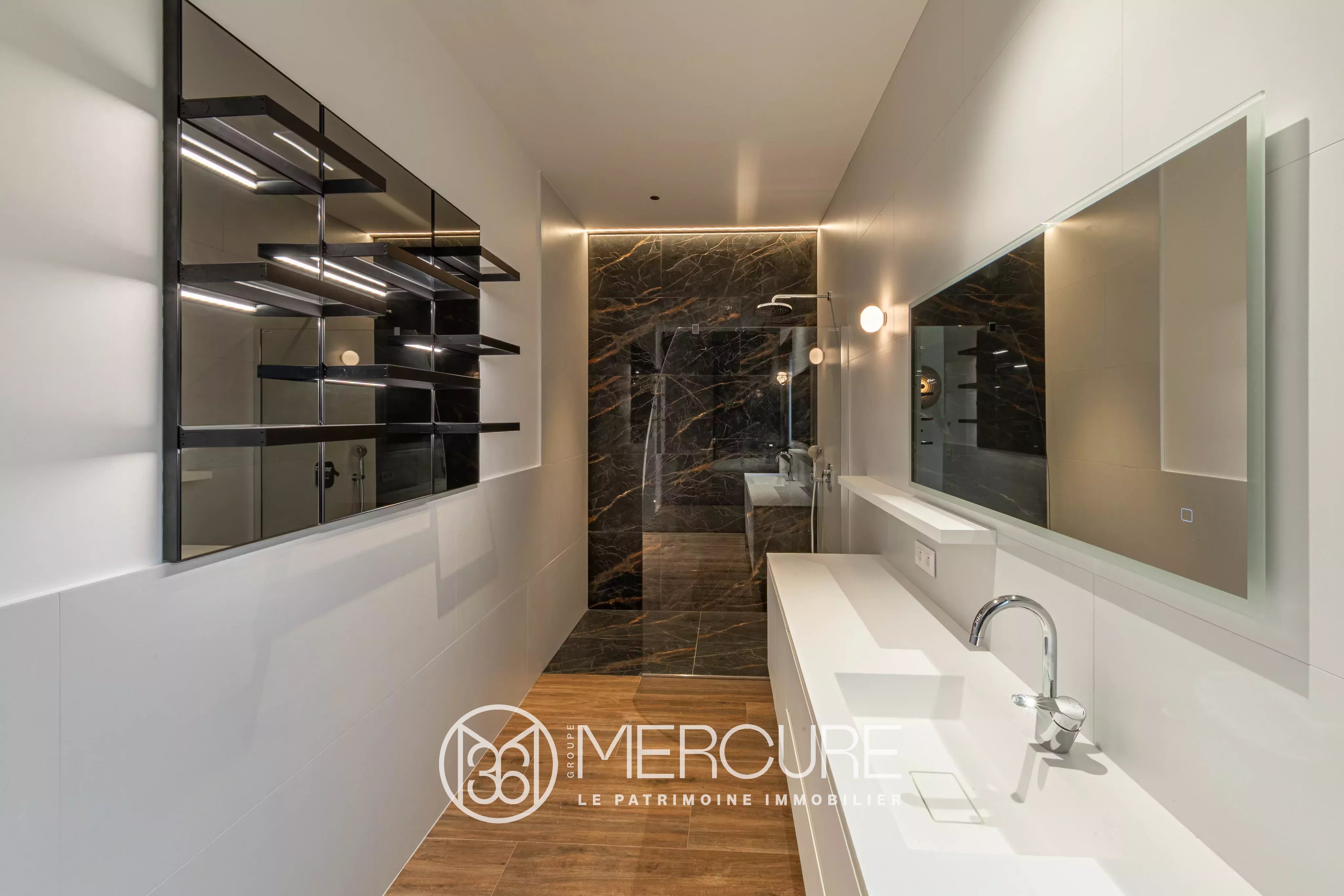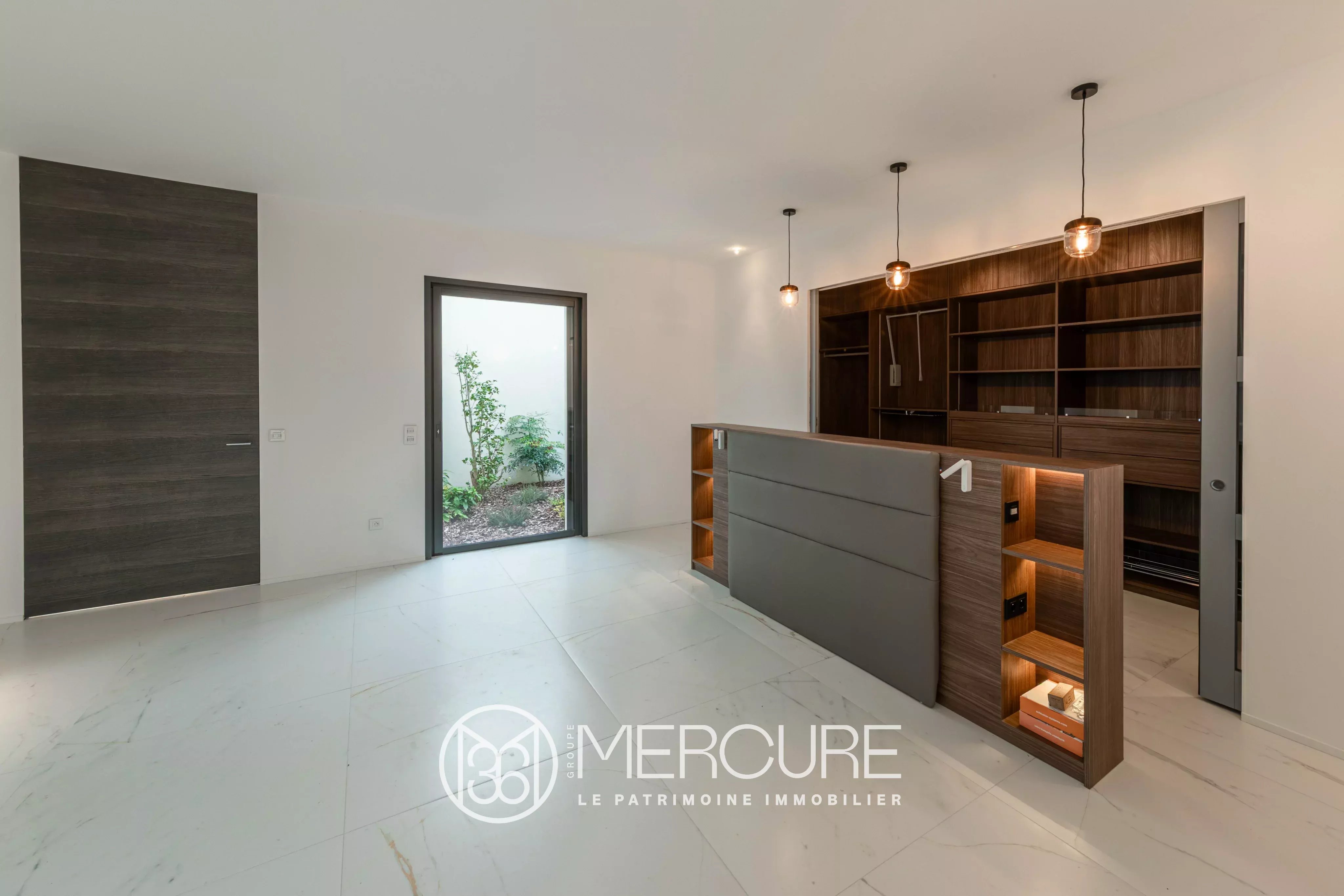 En rez-de-jardin, les volumes (hauteur sous plafond 3 mètres), les perspectives et les grandes ouvertures à galandages sur les quatre expositions participent à créer un cadre de vie exceptionnel et lumineux.