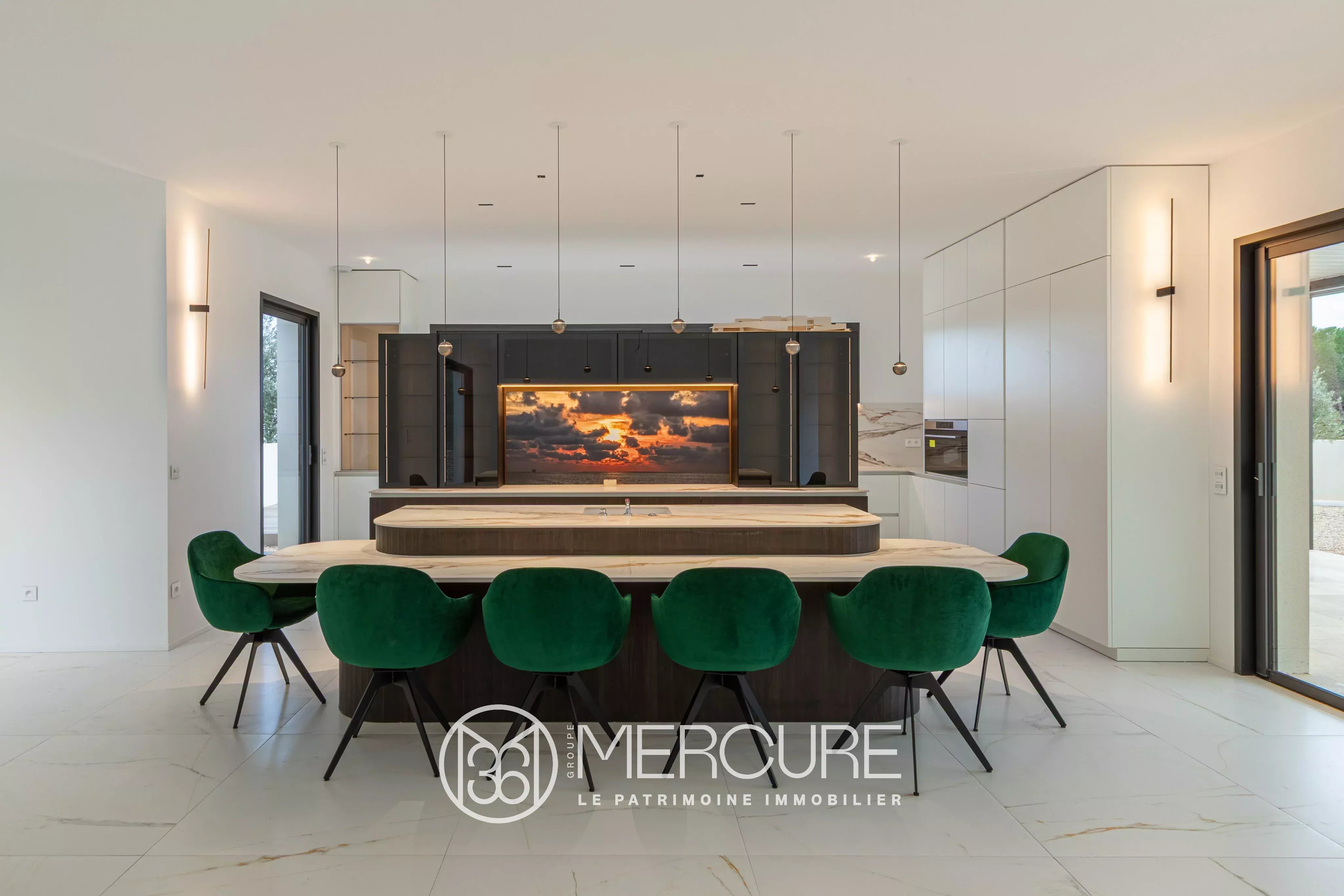 L’espace réception de plus de 130m² comprend un bureau/bibliothèque, un immense salon/salle à manger avec une cuisine équipée de grand standing et discrètement intégrée.