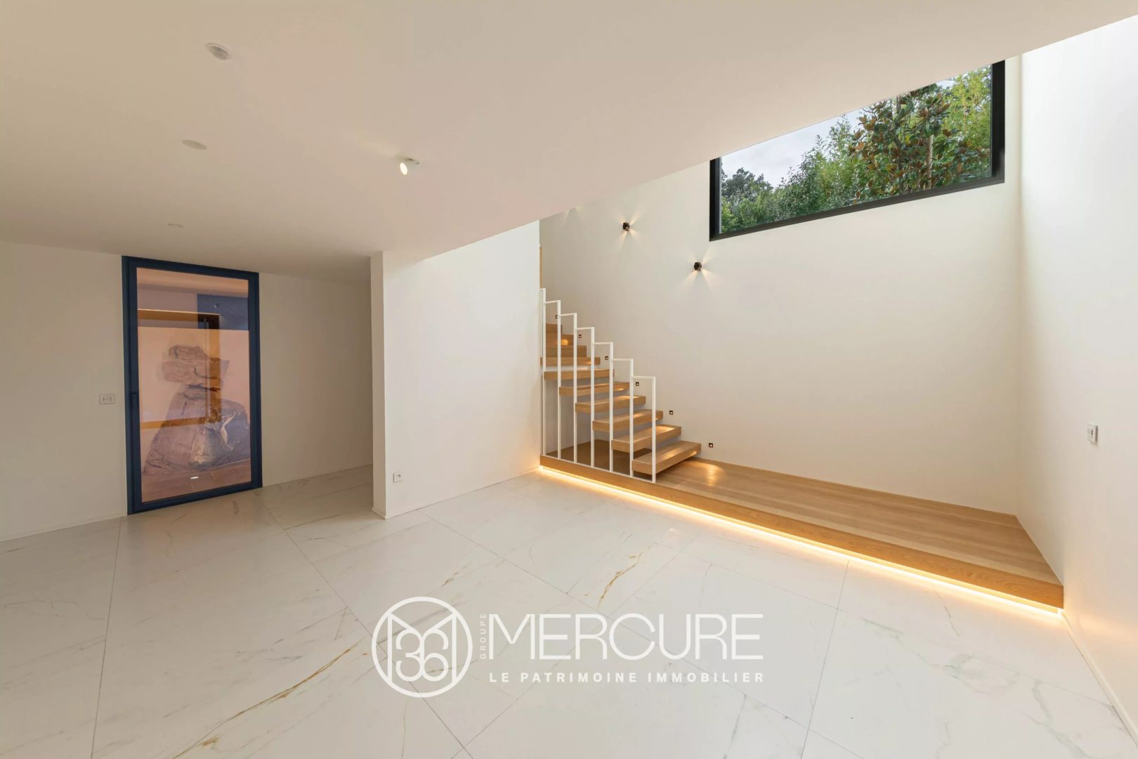 La partie basse du terrain regroupe l’accès voiture, les places de stationnement, le garage double et un hall d’entrée cathédrale, avec cave à vin, conçu pour recevoir un ascenseur.