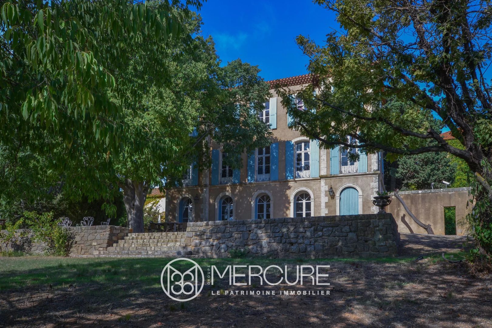 Cette propriété est aujourd’hui proposée à la vente avec son très beau parc méditerranéen aux arbres centenaires de 17 500 m² agrémenté d’une piscine et la majeure partie du chai mais sans les vignes ni les autres bâtiments du domaine qui lui tournent le dos.