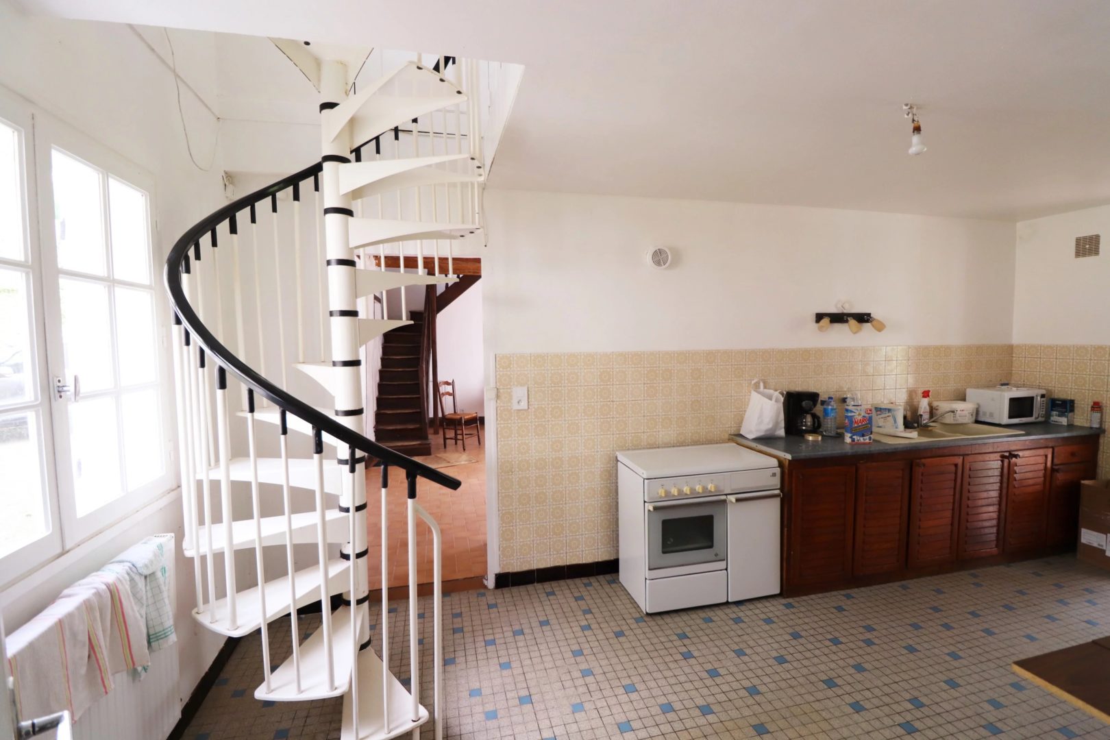 Au 1er étage, accès par un escalier en colimaçon : cuisine, palier de 5 m², deux chambres (16,80 et 13,90 m²), salle de bains de 6,75 m²,