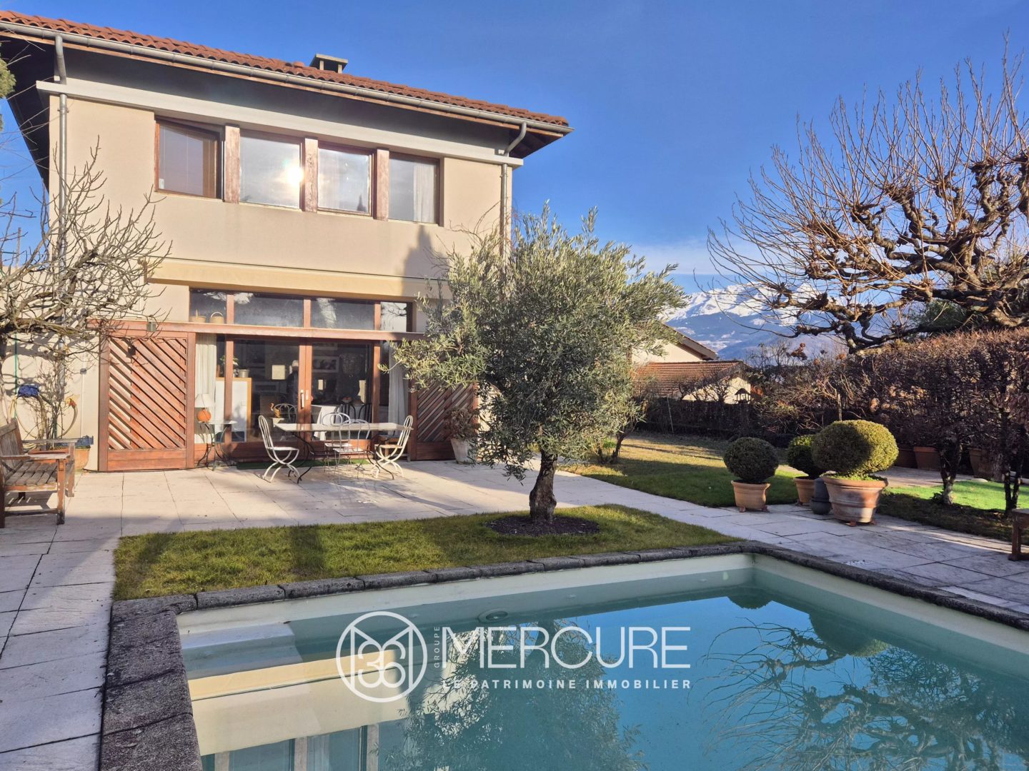 Elégante maison d’architecte de 1988 aux lignes intemporelles positionnée face à Belledonne sur un terrain plat de 1222 m² dont les plantations soignées assurent une vraie intimité.