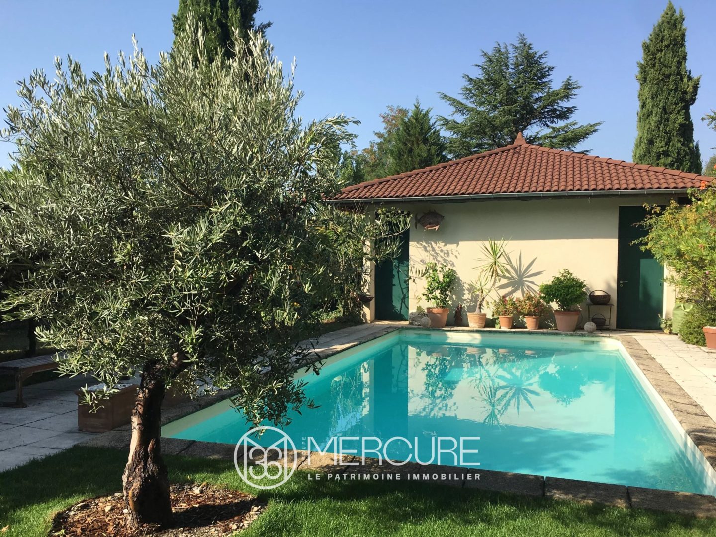 Agréable terrain arboré avec une piscine de 10 m x 4,5 m à l’abri des regards.