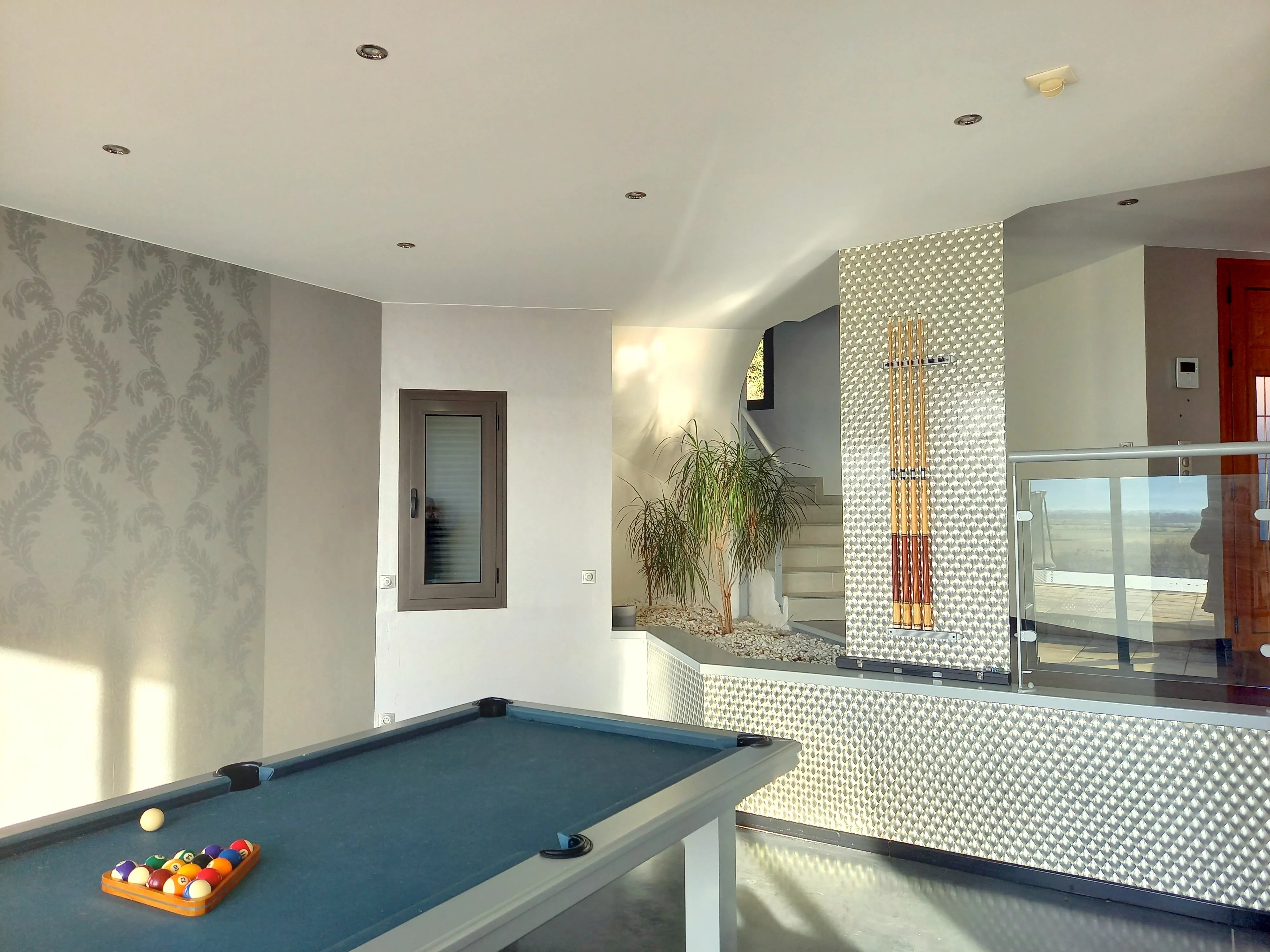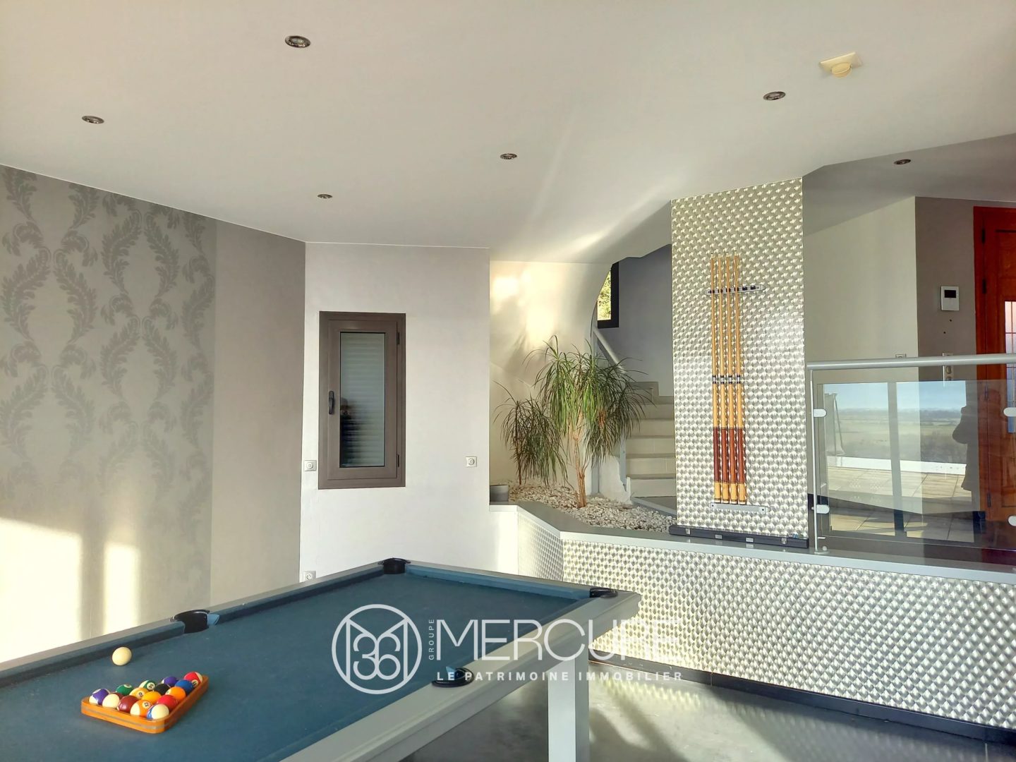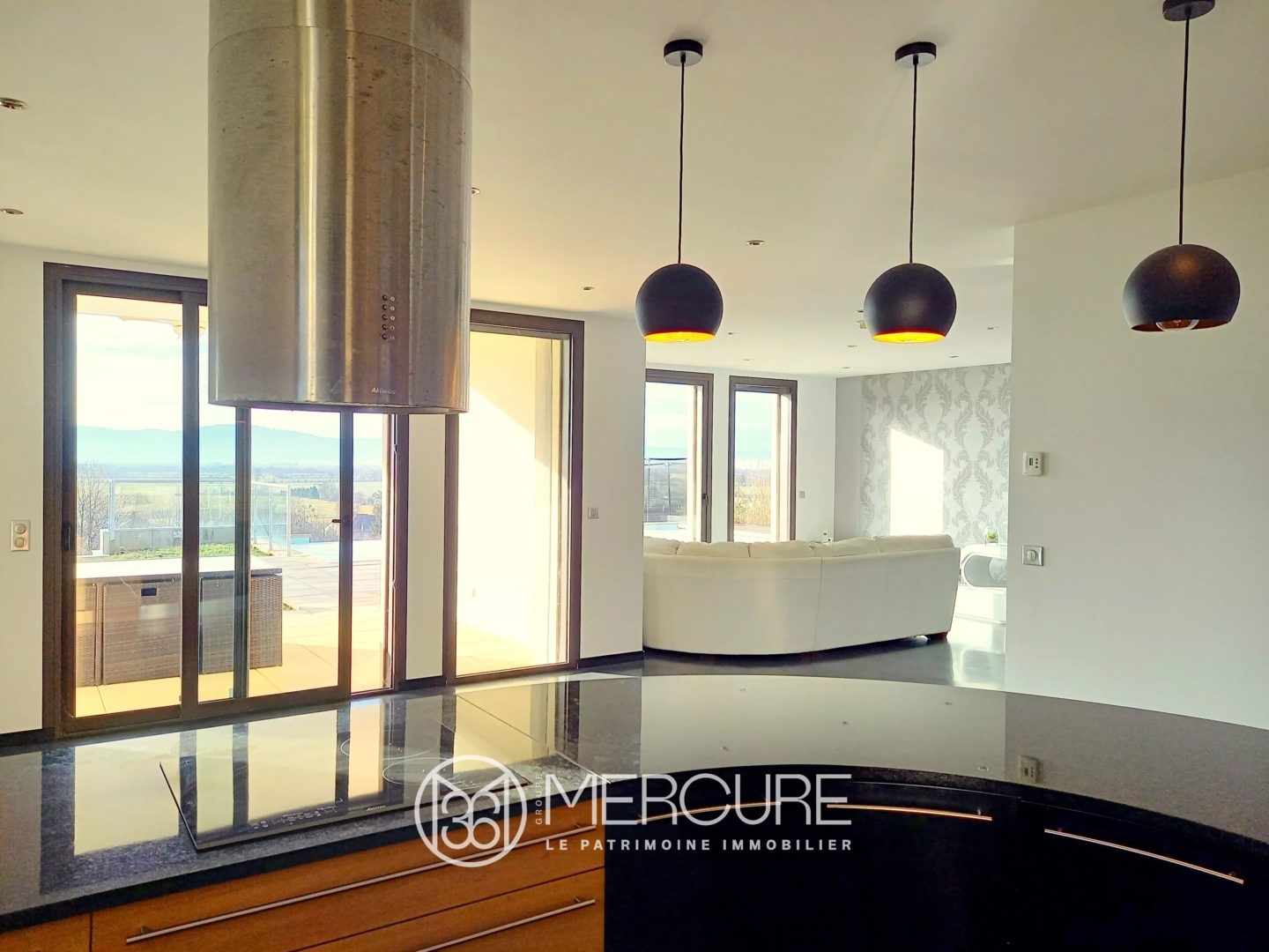 Au rez-de-chaussée, l’entrée mène aux pièces de réception, une grande cuisine ouverte sur la salle à manger, un salon et une salle de billard, toutes donnant sur la vue et sur une terrasse couverte. Les grandes baies vitrées, les grandes ouvertures entre les pièces apportent une magnifique luminosité. De chaque endroit, il est possible d’admirer le paysage. Une buanderie, des toilettes. Accès intérieur à un grand garage et au sous-sol.