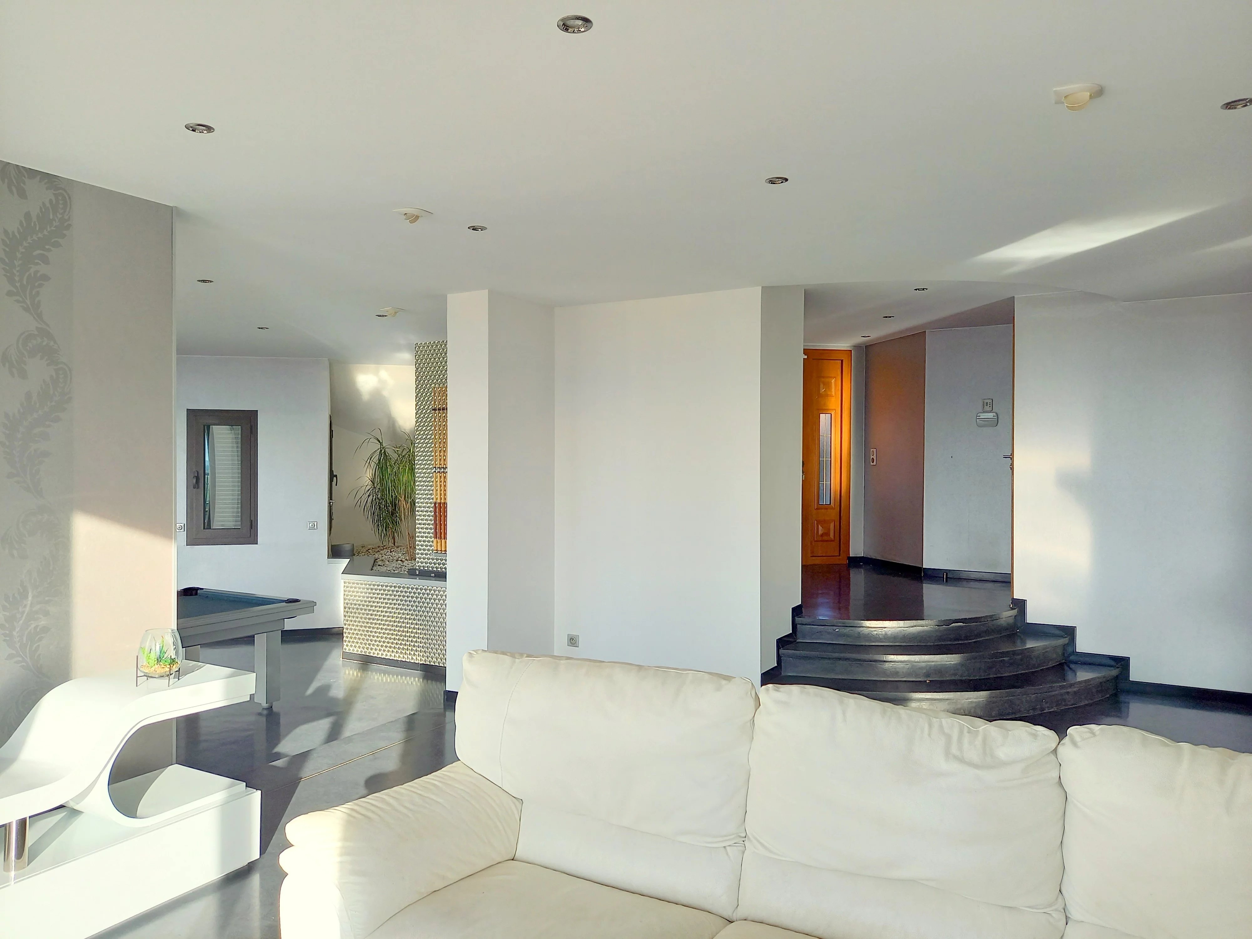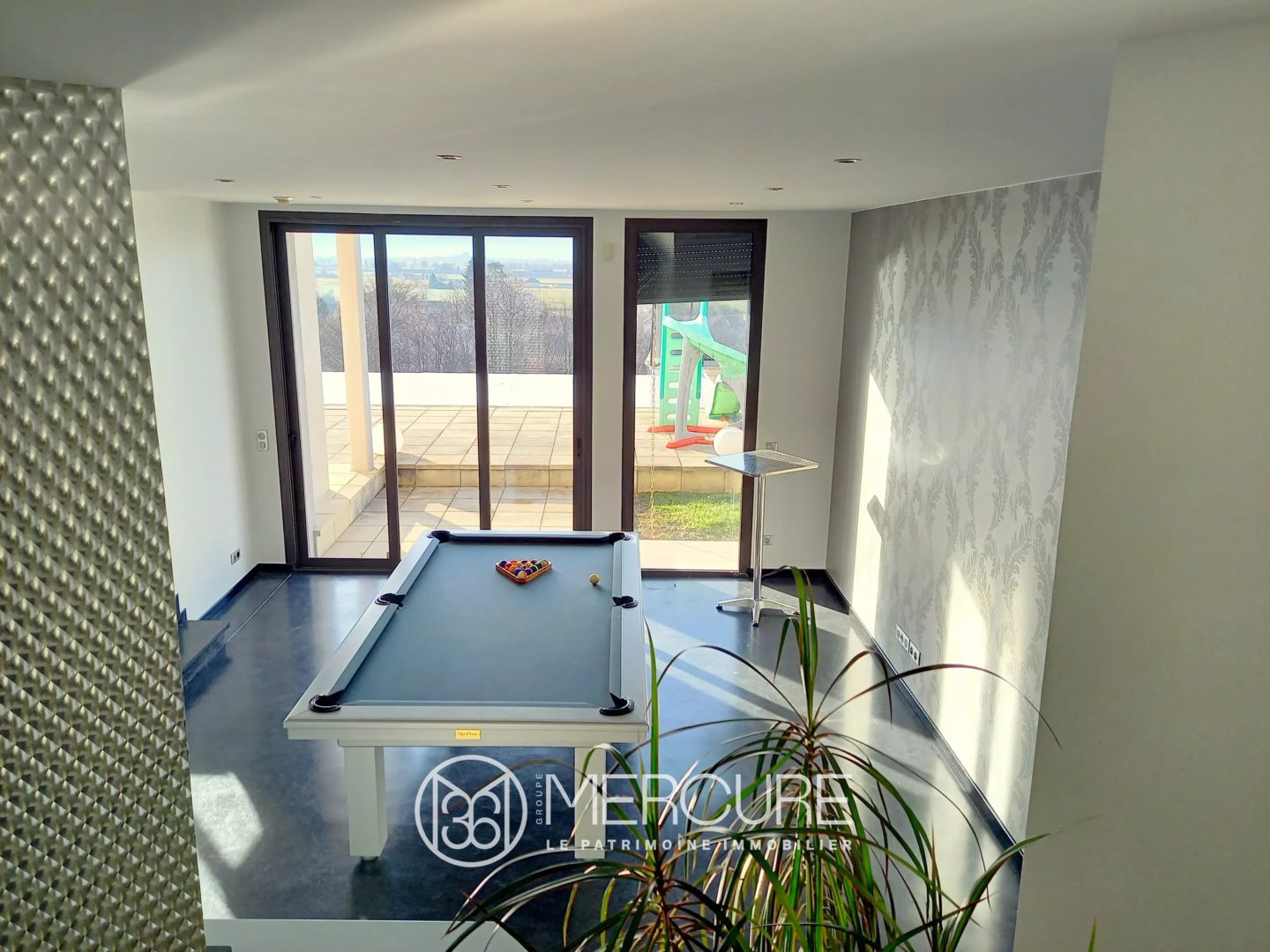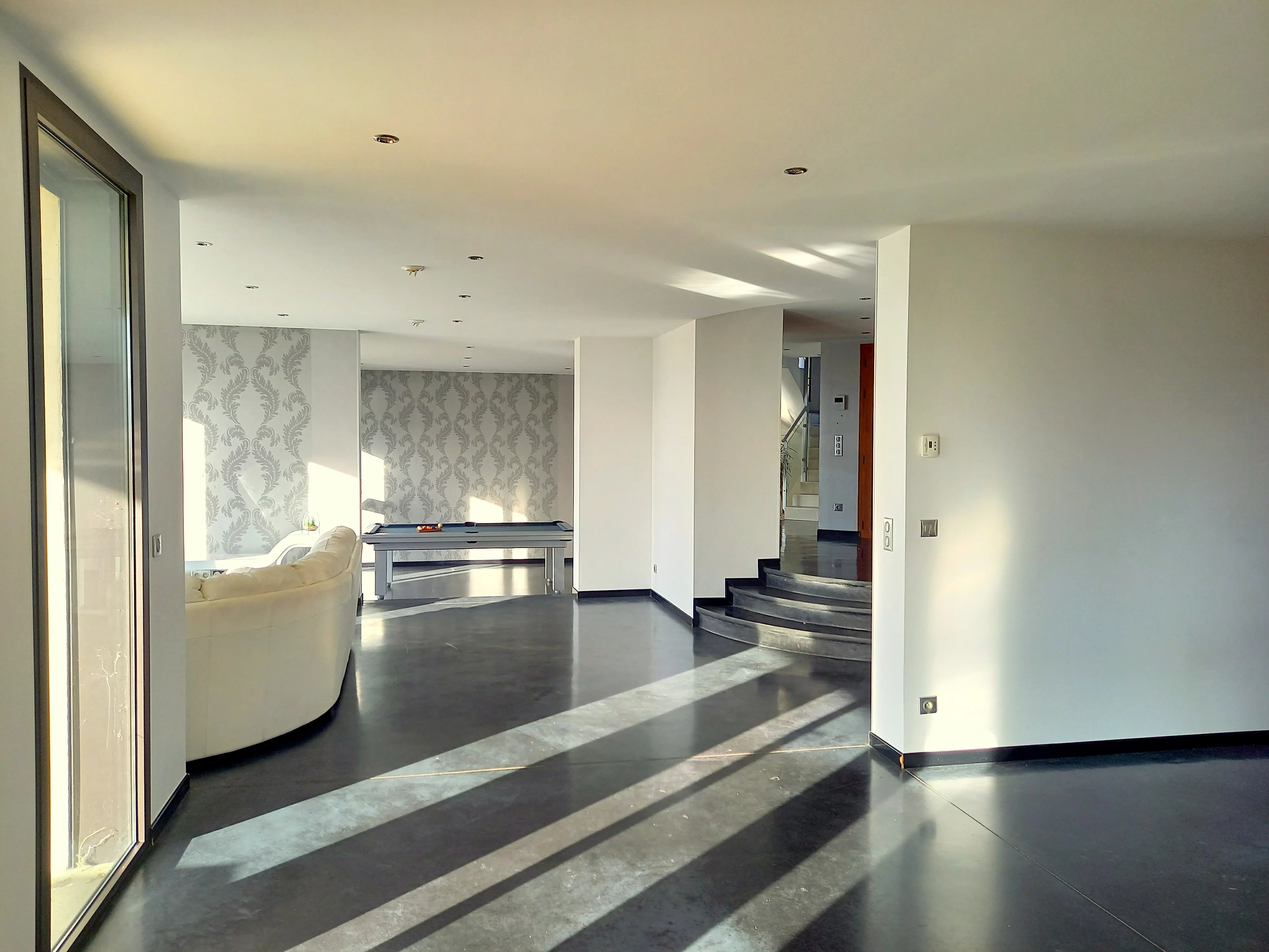 Au rez-de-chaussée, l’entrée mène aux pièces de réception, une grande cuisine ouverte sur la salle à manger, un salon et une salle de billard, toutes donnant sur la vue et sur une terrasse couverte. Les grandes baies vitrées, les grandes ouvertures entre les pièces apportent une magnifique luminosité. De chaque endroit, il est possible d’admirer le paysage. Une buanderie, des toilettes. Accès intérieur à un grand garage et au sous-sol.