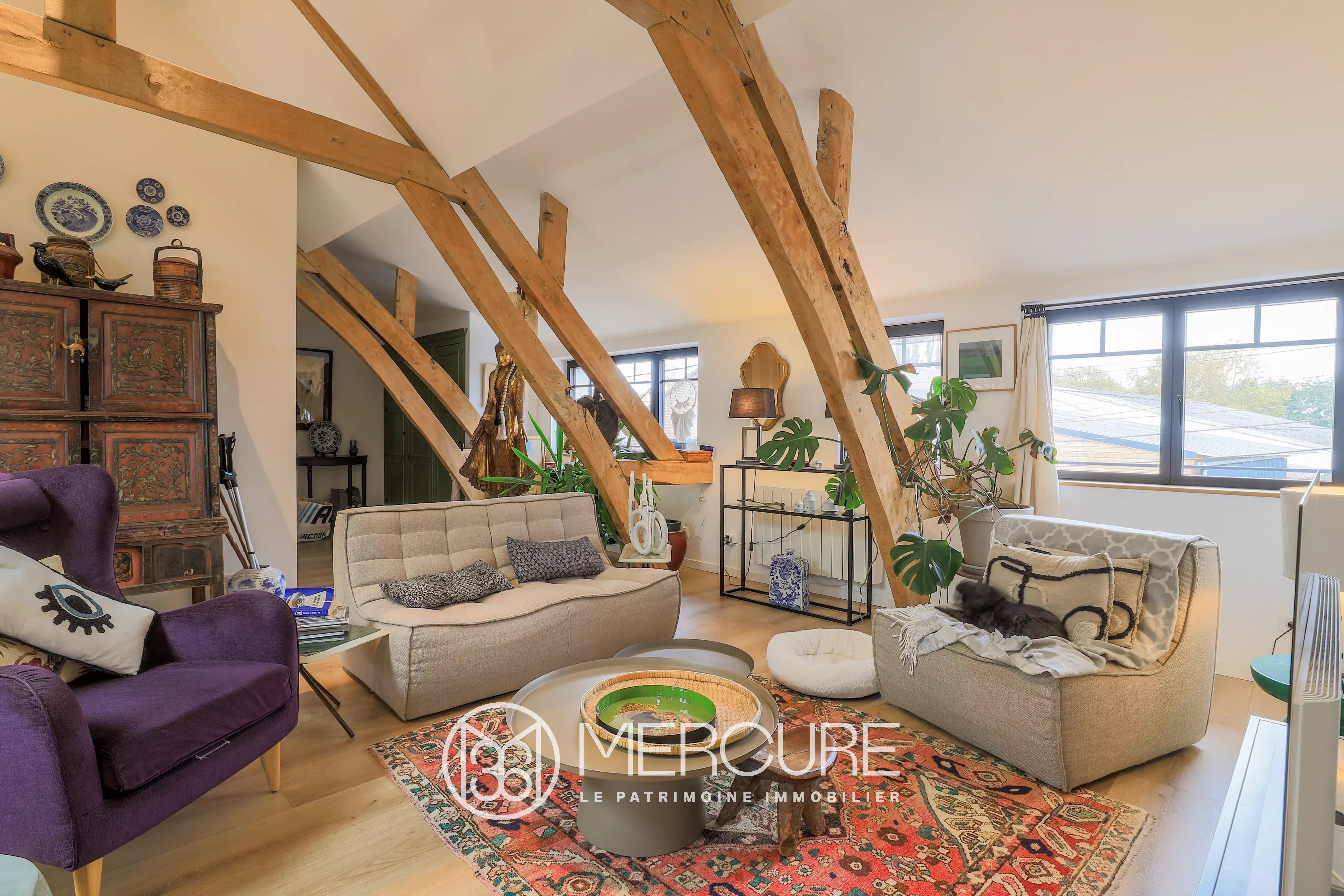 À l’étage, entièrement rénové, un magnifique appartement de 127m², sous une charpente apparente mise en valeur, dispose d’un vaste séjour, d’une cuisine équipée, d’un espace de rangement, d’une buanderie, de toilettes, et d’un espace nuit composé d’une chambre et d’une salle de bain avec douche à l’italienne, décorée avec soin et meublée sur mesure.