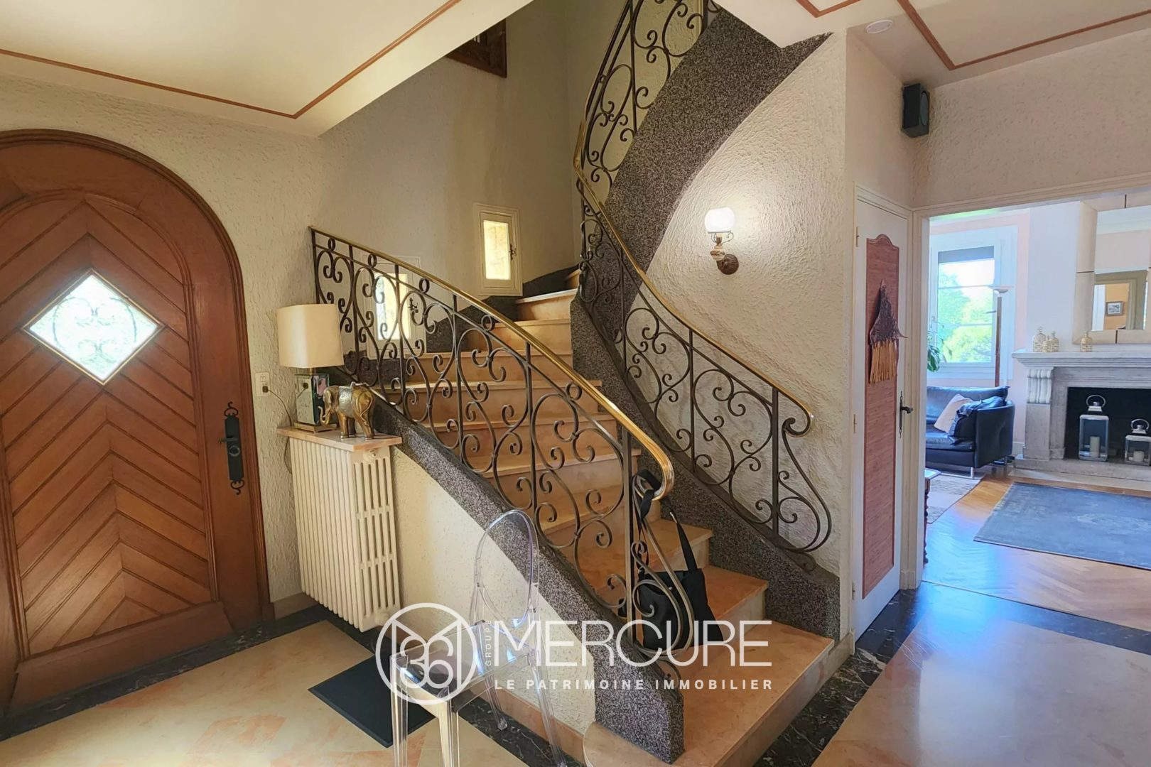 Dès l’entrée, on est accueilli par un hall élégant au sol en marbre, desservi par un bel escalier orné d’une rampe en ferronnerie d’art. Le rez-de-chaussée comprend un grand séjour lumineux, articulé en un espace salon et une salle à manger, ainsi qu’une cuisine indépendante entièrement équipée. Un second salon, agrémenté d’un poêle à insert, s’ouvre sur une agréable véranda avec vue sur le jardin. De l’autre côté de l’entrée se trouvent une chambre, un bureau, une salle de bains et des toilettes.