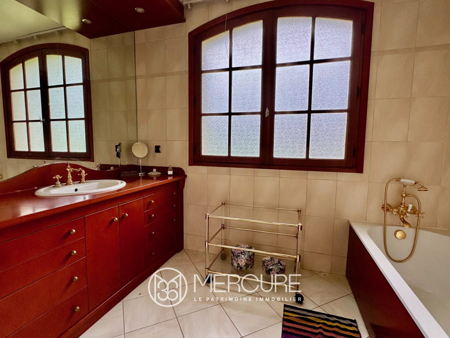 Un couloir mène à la chambre parentale, une grande salle de bains avec rangements, des toilettes séparées. Un bureau, entièrement repensé par un architecte Clermontois de renom, intégrant une porte coulissante sur mesure, véritable œuvre d’art composée à partir d’un tableau d’une artiste reconnue, complète le Rez-de-chaussée surélevé.