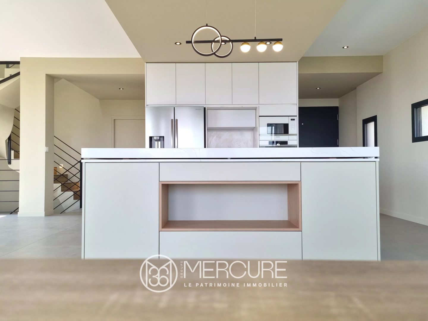 En rez-de-jardin haut : hall d’entrée avec rangements ouvrant sur une belle pièce de séjour de 85 m² avec espace cuisine équipée , bénéficiant d’une vue dégagée plein sud et donnant accès à une terrasse sud-ouest.