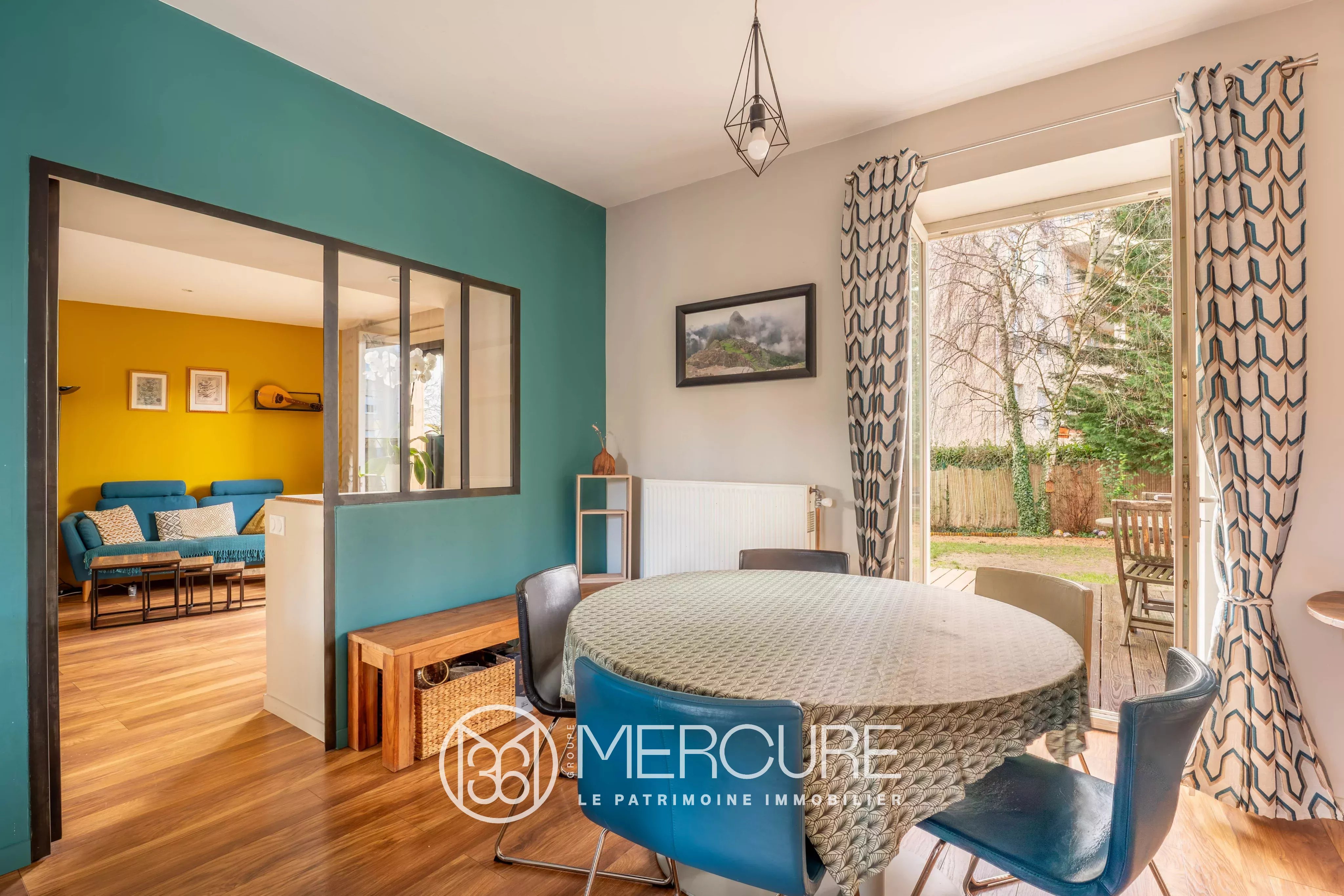 À l’extérieur, le jardin clos et arboré, prolongé par une terrasse bois exposée plein sud, constitue un véritable espace de détente. Les annexes, discrètement intégrées, facilitent l’organisation du quotidien.