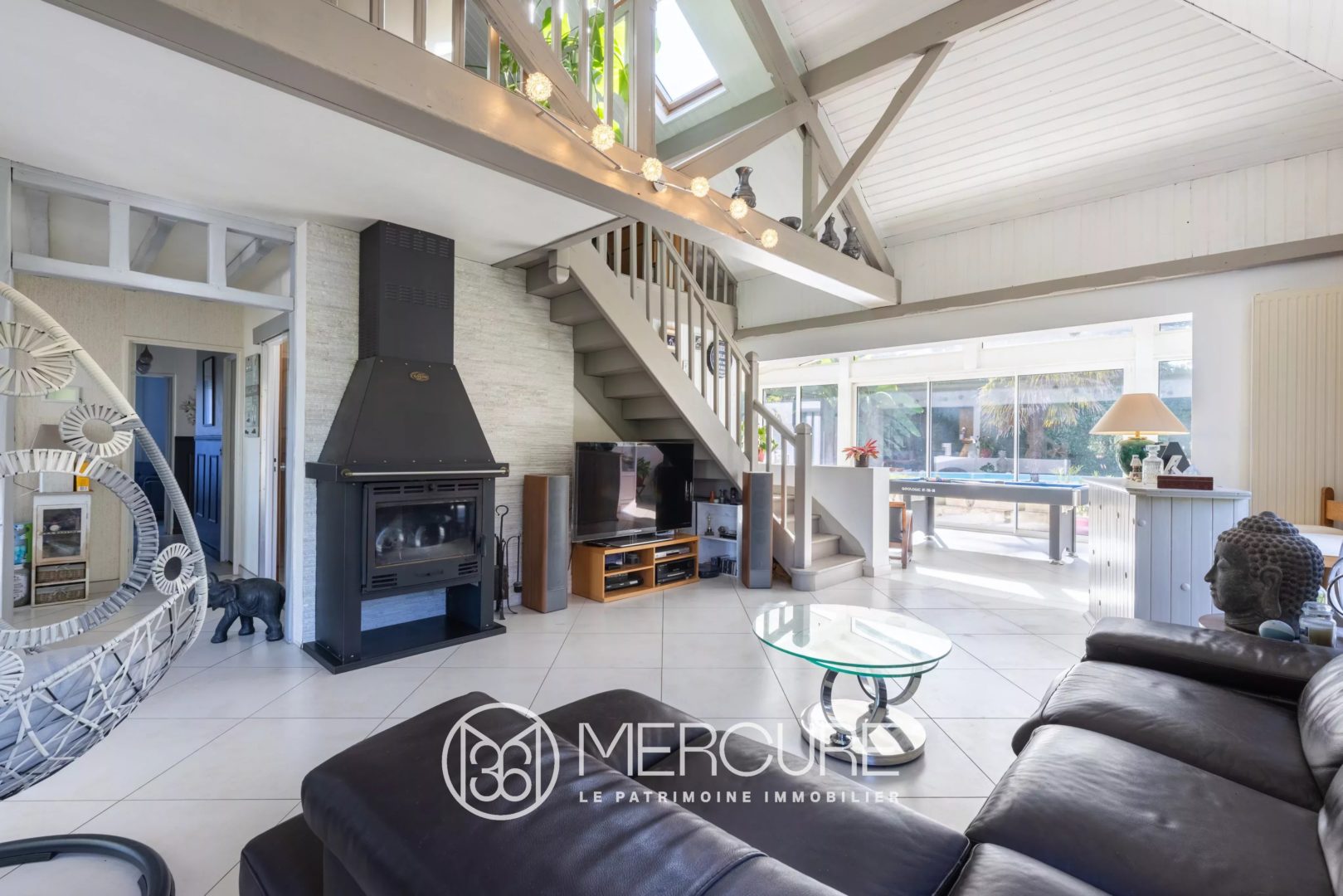 Magnifique séjour, doté d’un poêle à bois Godin, bénéficie d’une hauteur sous plafond cathédrale et d’une triple exposition. Il s’ouvre sur un jardin sans aucun vis-à-vis, agrémenté d’une piscine chauffée.