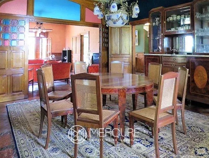 Un grand escalier extérieur mène à l’entrée principale et à une grande terrasse. Salon/Bibliothèque, cuisine avec arrière cuisine et accès à la terrasse, salle à manger et vaste séjour en enfilade avec de jolies cheminées en marbre.
