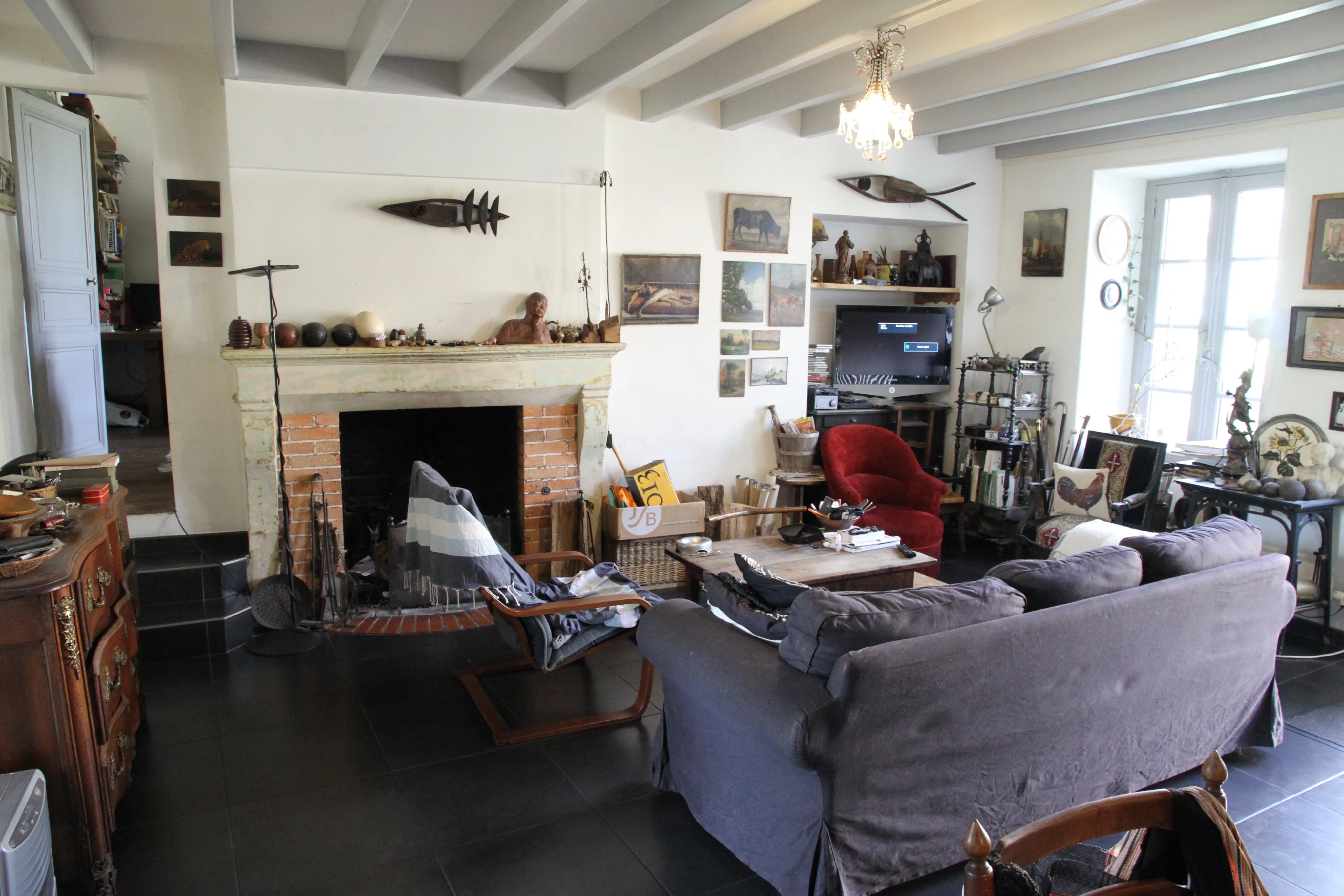 – Salle à manger avec cuisine ouverte aménagée, cheminée pierre et poutres (41,75 m²)
